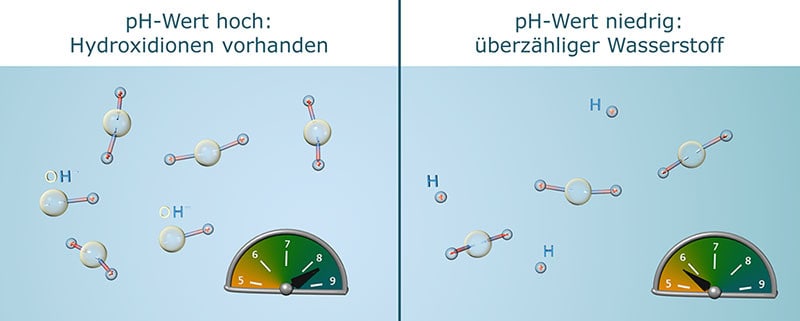 Gibt es dagegen mehr OH⁻-Ionen, steigt der pH-Wert an – das Wasser wird basisch.