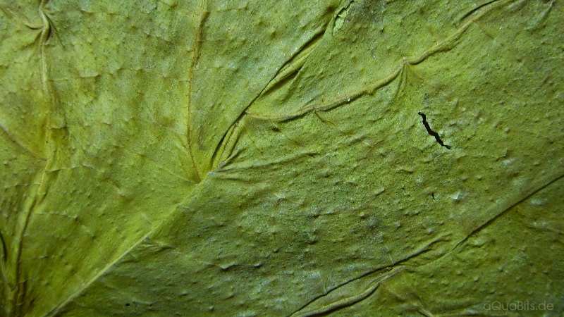 Nachdem wir oben genanntes im Internet gelesen hatten, wurden wir neugierig – schließlich verwenden asiatische Garnelenzüchter auch schon sehr lange diese Blätter erfolgreich – und bestellten uns welche. Die Blätter gehen innerhalb weniger Stunden von alleine unter, doch ab der ersten Minute wenn sie im Wasser sind, hängen die Garnelen in Scharen an den Blättern. Meist ist am nächsten – spätestens übernächsten Tag nichts mehr von den Blättern zu sehen und selbst unsere kleinen Ohrgitterharnischwelse nuckeln sehr gerne daran.