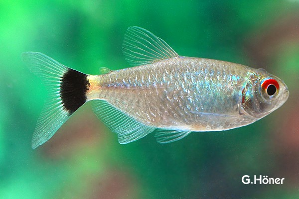 Dieser Salmler ist nicht ganz so bunt, wie die beiden anderen, doch auch er trägt eine schöne Färbung. Namensgebend ist sein rot umrandetes Auge, der Körper ist eher farblos und den Schwanz ziert ein so genannter schwarzer Schwanzwurzelfleck. Da er ausgewachsen eine Länge von etwa 7 cm erreichen kann, sollte hier besonders darauf geachtet werden, dass dem Schwarm genügend Platz und Schwimmraum zur Verfügung steht. Gefüttert werden kann sowohl mit Trockenfutter als auch mit Frostfutter wie z.B. gefrorene Mückenlarven oder Wasserflöhe.