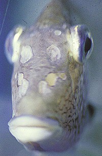 Die Lochkrankheit wird durch Flagellaten der Gattung Spironucleus oder Protoopalina hervorgerufen. Unter bestimmten Bedingungen, die noch nicht eindeutig spezifiziert werden konnten, kommt es zu einer massenhaften Vermehrung der Flagellaten, die im Darm der Fische leben. Sie treten in ernsthafte Nahrungskonkurrenz um die Mineralien mit dem Fisch, der dann unter Mineralienmangel leidet. Als Reaktion auf den Mineralienmangel baut er eigenes Knochengewebe ab, um an Mineralien zu gelangen. Da der Fisch im Kopfbereich über die größte Knochensubstanz verfügt, kommt es speziell in diesem Bereich zu massivem Abbau, der als Löcher zu sehen ist. Die Flagellaten wandern während dessen zur nächstgelegenen Körperoberfläche. Da die entstandenen Löcher nun die nächstliegende Körperoberfläche darstellt, können sie am Grund der Löcher gefunden werden. So wurde früher nur der Flagellat für diese Krankheit verantwortlich gemacht. Tatsächlich ist es jedoch so, dass ein Zusammentreffen von Mineralienmangel mit einem massenhaften Vermehren der Flagellaten zur Lochbildung führt. Auch Bandwürmer, Fadenwürmer und Fisch-Tuberkulose sowie Fehlernährung können zu einer Lochbildung führen. Abhilfe: Erhöhen Sie durch Zugabe von einem Aufhärtesalz den Mineraliengehalt des Wassers. Ein Auftreten der Lochkrankheit konnte bisher nur in sehr weichem Wasser beobachtet werden.