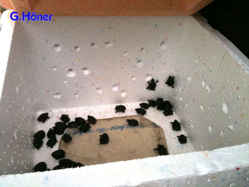Wenn neue Schildkröten geliefert werden, ist das jedes mal ein Schauspiel. Die kleinen versuchen mit ihren Zehen die Styroporwände hinaufzuklettern, sodass aus den Kisten ein einziges Gekratze und Geraschel zu hören ist.