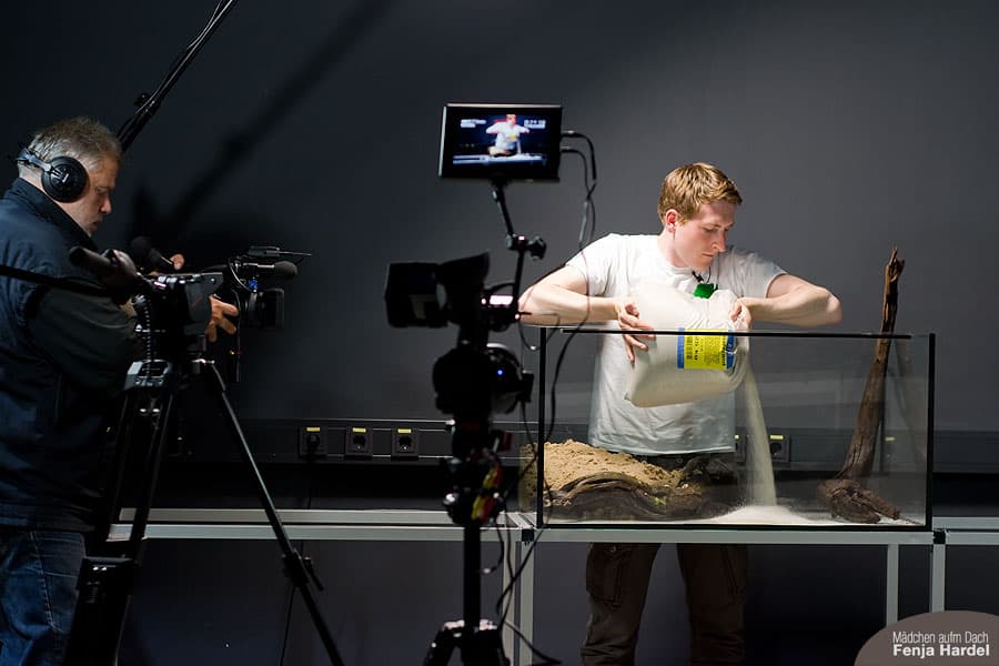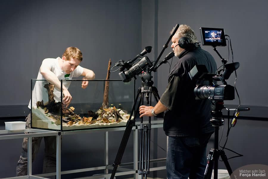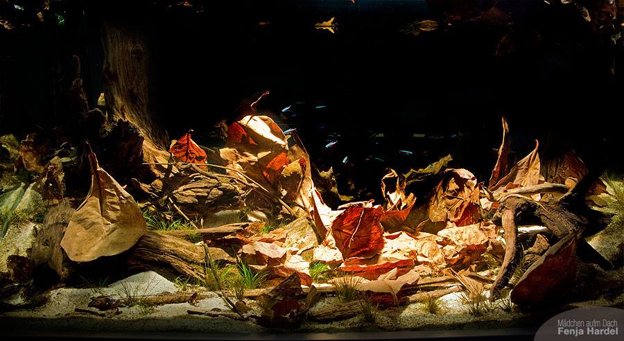 Das Aquarium, das Benjamin extra für die Dreharbeiten und den Thementag Biotop-Aquarstik einrichtete, ahmte einen Ausschnitt des Lago Zalala im Rio Negro System nach. Charakteristisch für die Einrichtung waren verschiedene Hölzer, ein feiner, sandiger Boden und eine Laubschicht, die teilweise den Aquarienboden bedeckte. Die Einrichtung dieses Schwarzwasser-Aquariums hielt Andreas Stelzig professionell in bewegten Bildern ein, die nun auf YouTube zu sehen sind .