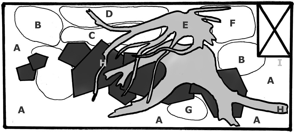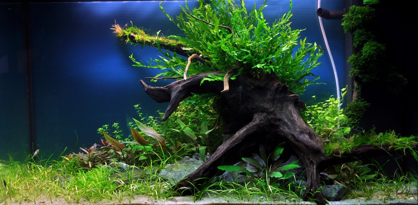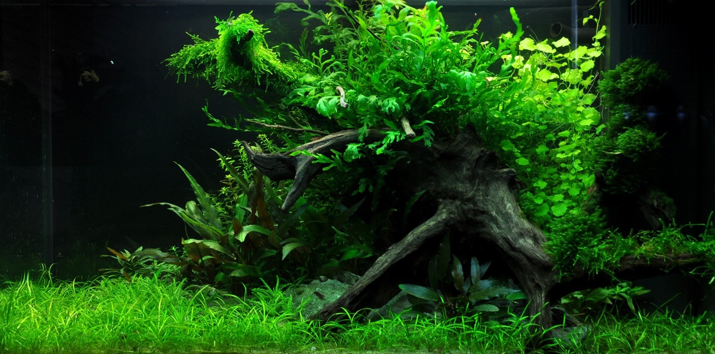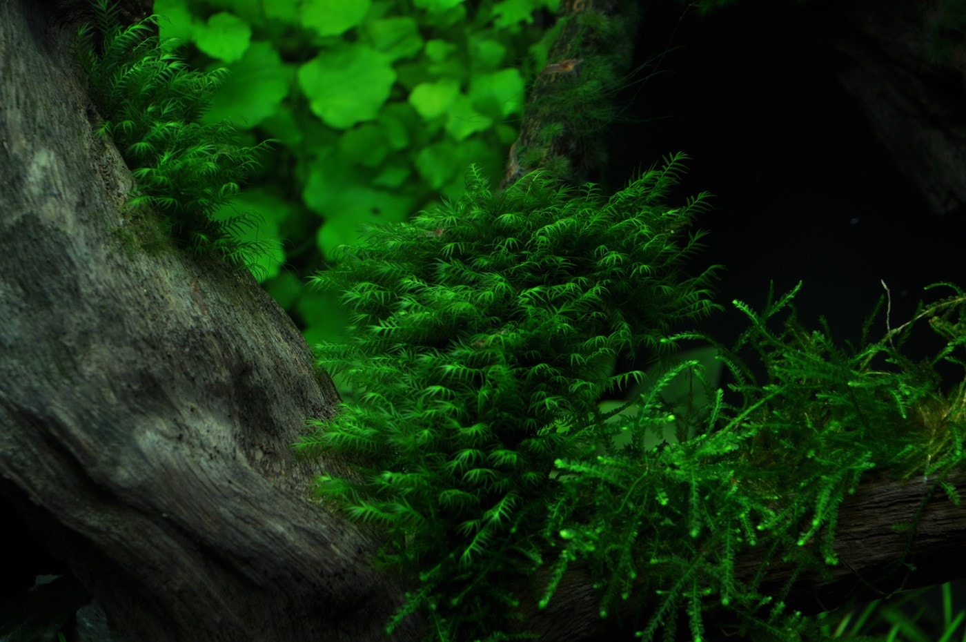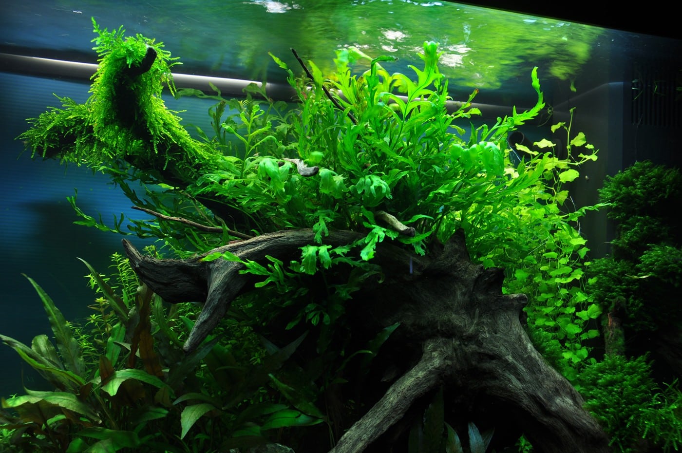 Der große alte Baum am Waldrand neigt sich über die offene Wiese, das Lichterspiel bricht sich in der Baumkrone (Bolbitis). Die Baumkrone sorgt für Bereiche mit flimmernden Schatten. Cardamine steht an einem lichten Fleck und bildet einen frischgrünen Hintergrund. In den schattigen Bereichen wurde Cryptocoryne gepflanzt. Moos an den Zweigen lassen den Baum üppig und alt aussehen. Hinter dem Baum bildet Rotala eine absteigende Linie. Der Eckfilter wird teilweise durch Fissidens an einer aufgehängten Wurzel verdeckt. Durch die vielen Pflanzen befindet sich das Aquarium im Gleichgewicht. Echinodorus tenellus und die Stängelpflanzen müssen jedoch laufend getrimmt werden.