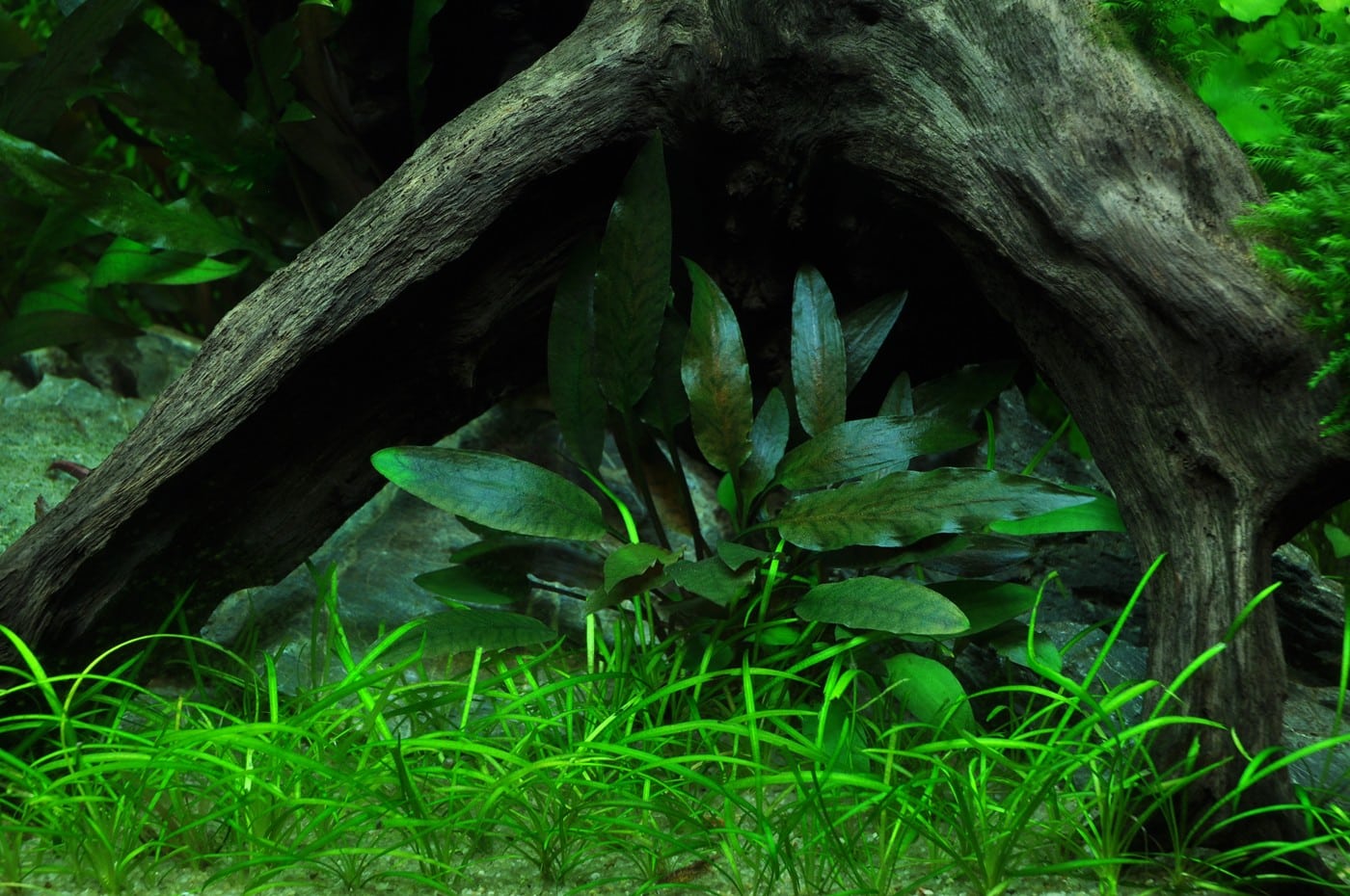 Tipp: Die Platzierung von Bolbitis nahe der Wasseroberfläche bzw. der Lichtquelle sorgt für schöne Effekte im Aquarium, da die Wasserströmung Bewegung in die Blätter von Bolbitis bringt und Licht und Schatten Wellen in den Teppich aus Echinodorus tenellus schlagen