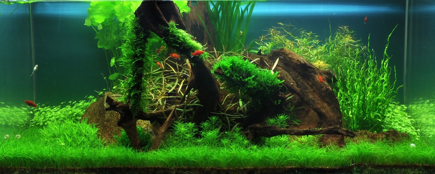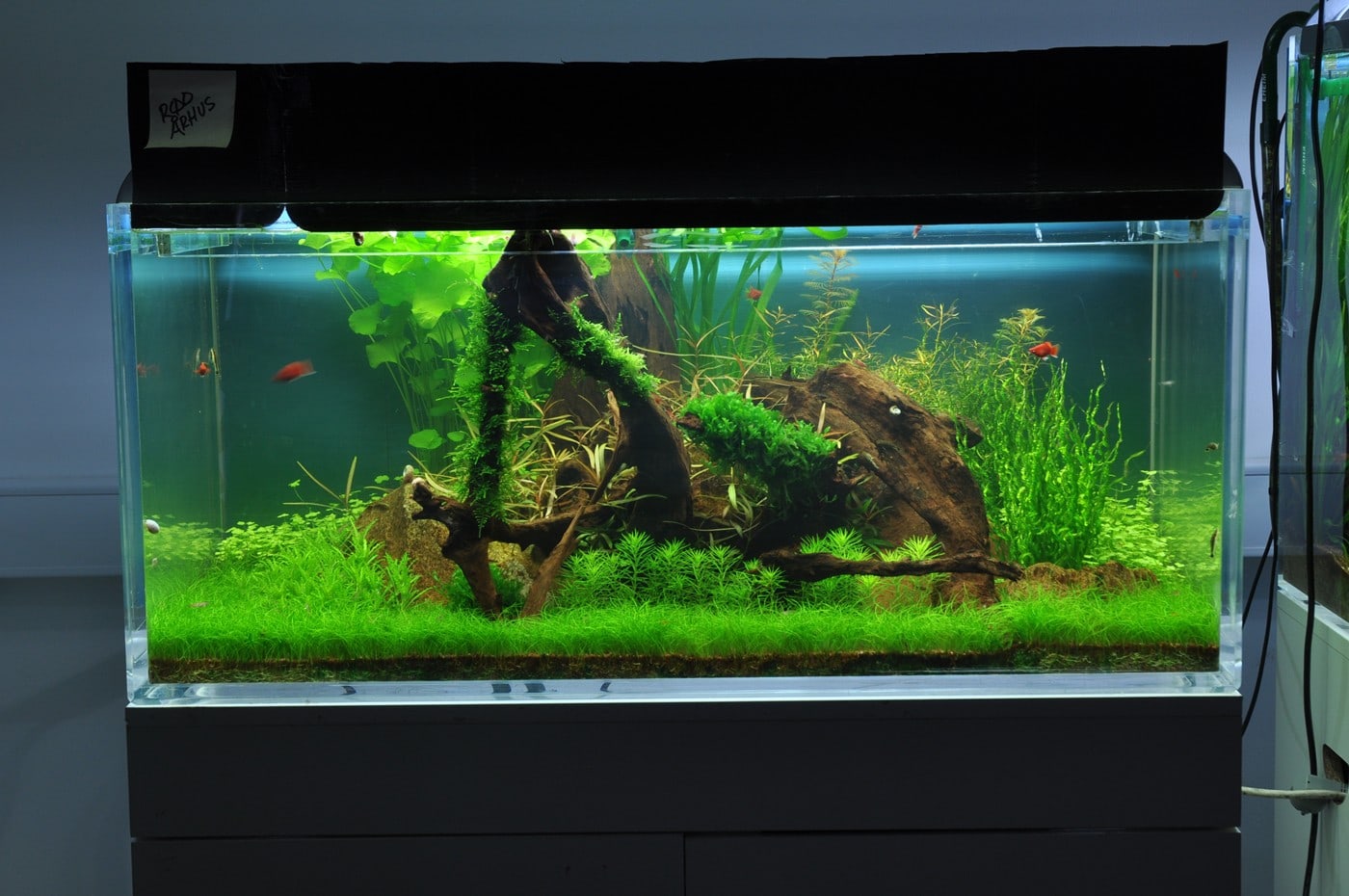 Rotes Granitgestein und solide Mangrovenwurzeln bilden das Hardscape in diesem Aquarium. Dank der guten Lichtverhältnisse und der CO₂-Zufuhr kommen die kompakte, rötliche Hygrophila sp. ‚Araguaia‘ und die schlanke Proserpinaca und Ludwigia arcuata voll zur Geltung. Die etwas anspruchsvolle Utricularia hat sich in einem Untergrund aus dunklem Spiky-Moos, das zusammen mit Monosolenium fast einen Bilderrahmen mitten im Aquarium bildet, gut etabliert. Ein solider Teppich aus Eleocharis, Pogostemon helferi und Hydrocotyle kontrastiert und betont die jeweiligen Blattstrukturen.