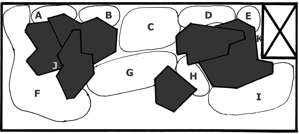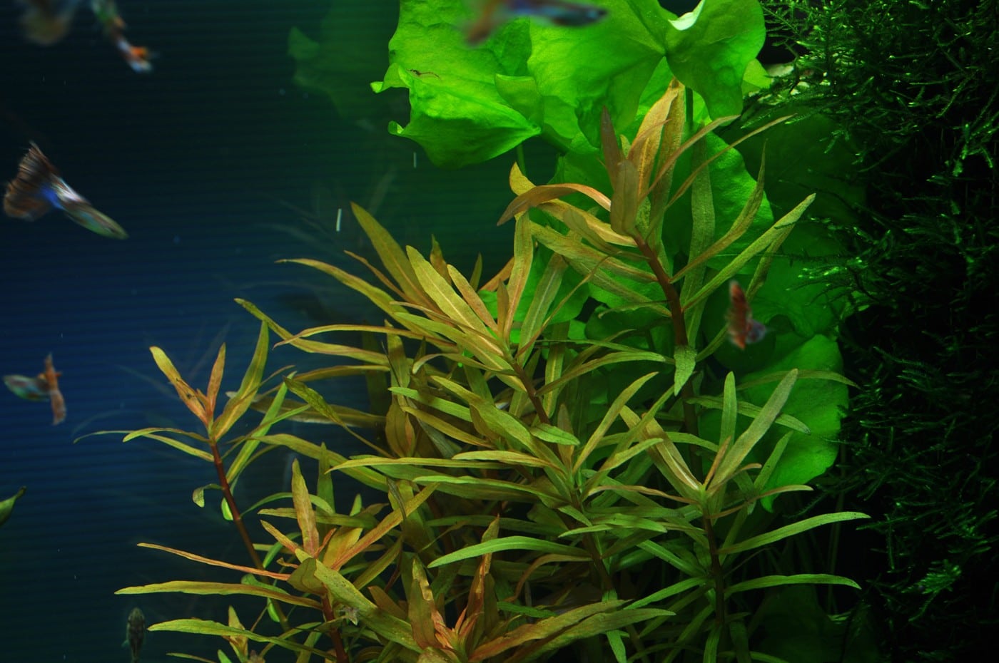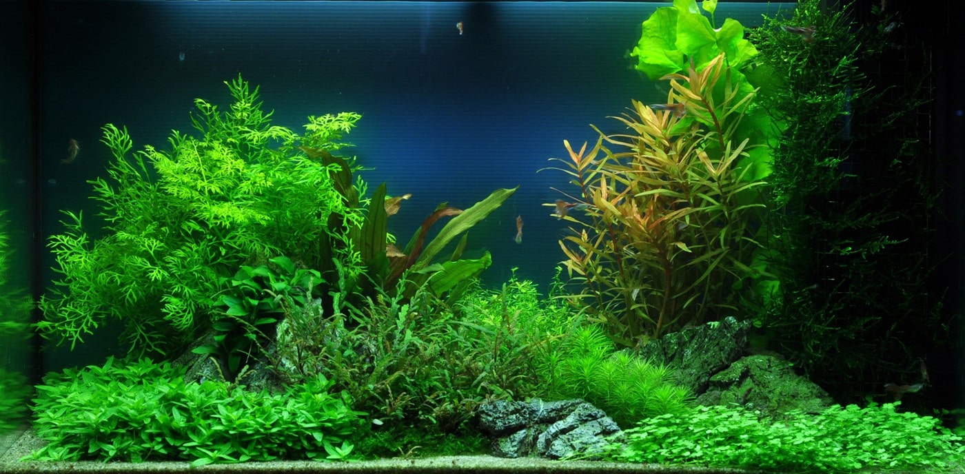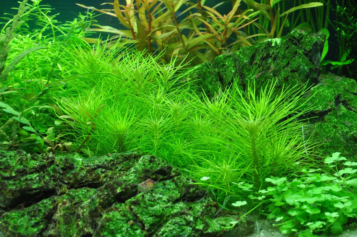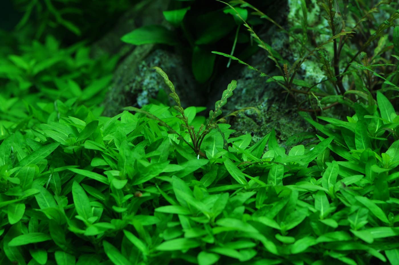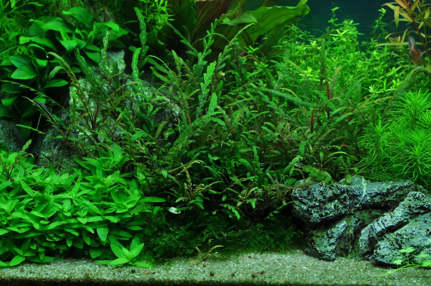 Eine reine und kultivierte Landschaft, in der alles seinen Platz hat. Hell und freundlich. Der vorwiegend hellgrüne Gesamteindruck aus Ceratopteris, Rotala, Hydrocotyle und Nymphoides wird durch den roten Echinodorus, die orangefarbene Nesaea und die orange-grüne Hygrophila pinnatifida aufgelockert. Unter der Hygrophila pinnatifida wächst ‚Christmas‘-Moos. Rechts bildet ‚Spiky‘-Moos eine dunkle, etwas geheimnisvolle Fläche – und verdeckt gleichzeitig den Filter! Die Triebe von Hygrophila pinnatifida und Staurogyne laufend abkneifen, um einen niedrigen, kompakten Wuchs zu fördern. Rotala als Tal im Hintergrund niedrig halten. Die Felsbrocken müssen zwischen den Pflanzengruppen sichtbar bleiben.
