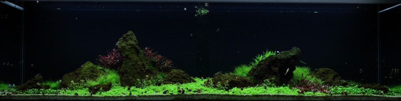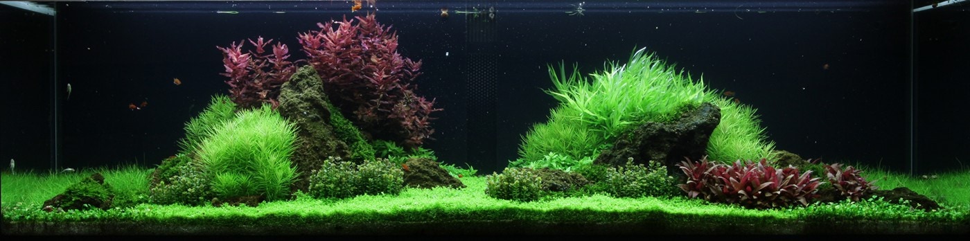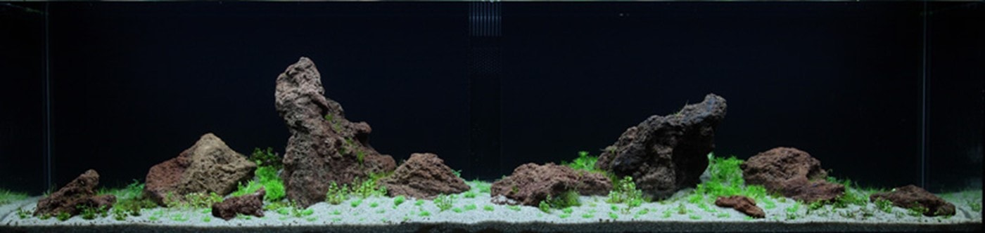 Pogostemon erectus, Staurogyne und Heteranthera schmiegen sich in weichen Linien um große Lavablöcke. Hemianthus Cuba, Eleocharis und Marsilea schaffen waagerechte, ruhige Flächen, während Rotala macrandra und Alternanthera als Blickfang fungieren. Alle Pflanzen stammen aus dem 1-2-Grow!-Programm – direkt aus dem Labor in kleinen sterilen Bechern ohne Algen, Schnecken oder Pestizide. Durch ihre vielen Wachstumspunkte sind die 1-2-Grow!-Pflanzen erheblich dichter und kompakter. Die einzigartigen Rotala macrandra und Rotala sp. ‚Bonsai‘ gibt es nur im 1-2-Grow!-Programm und sind der Hingucker in diesem Layout.