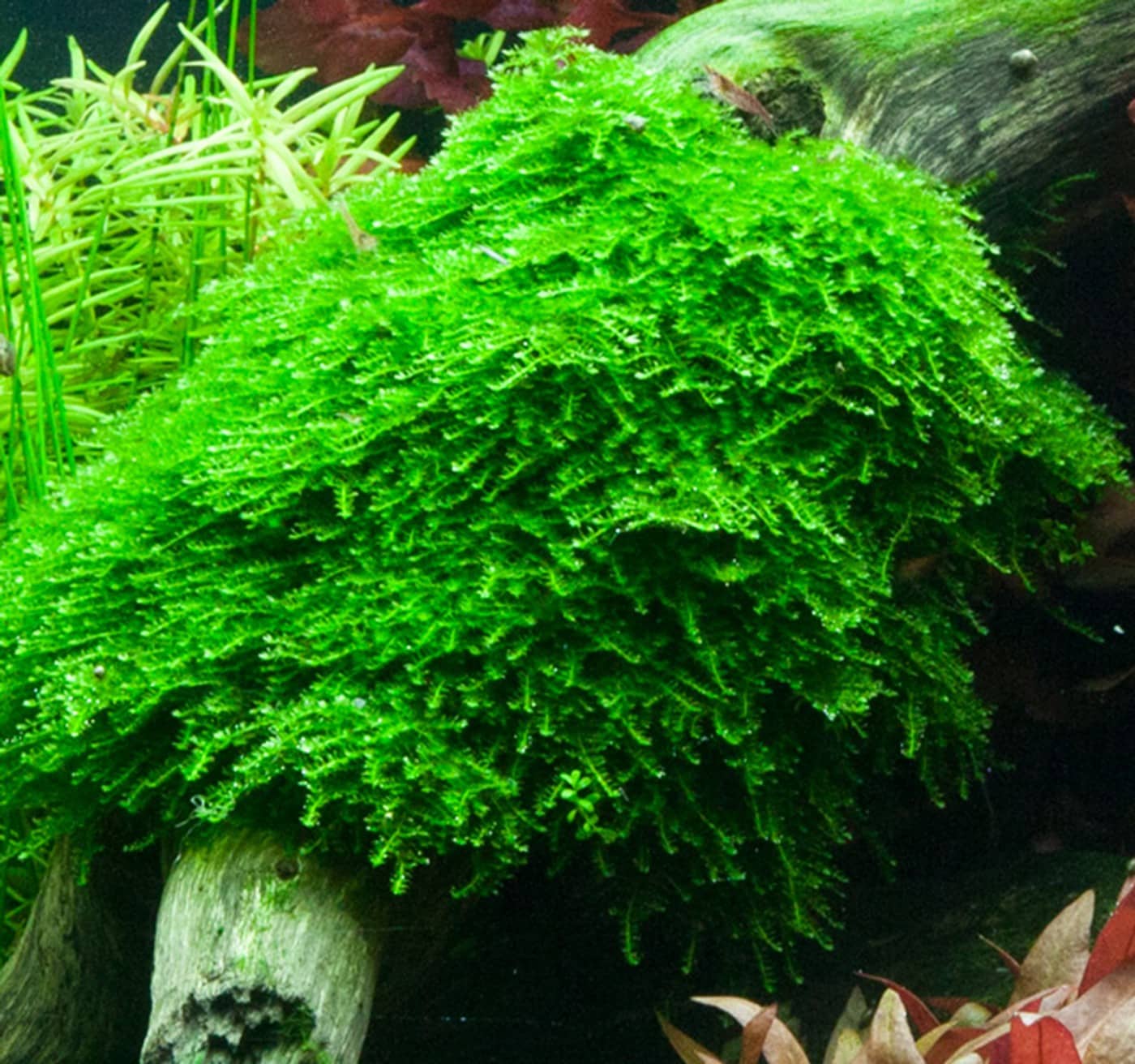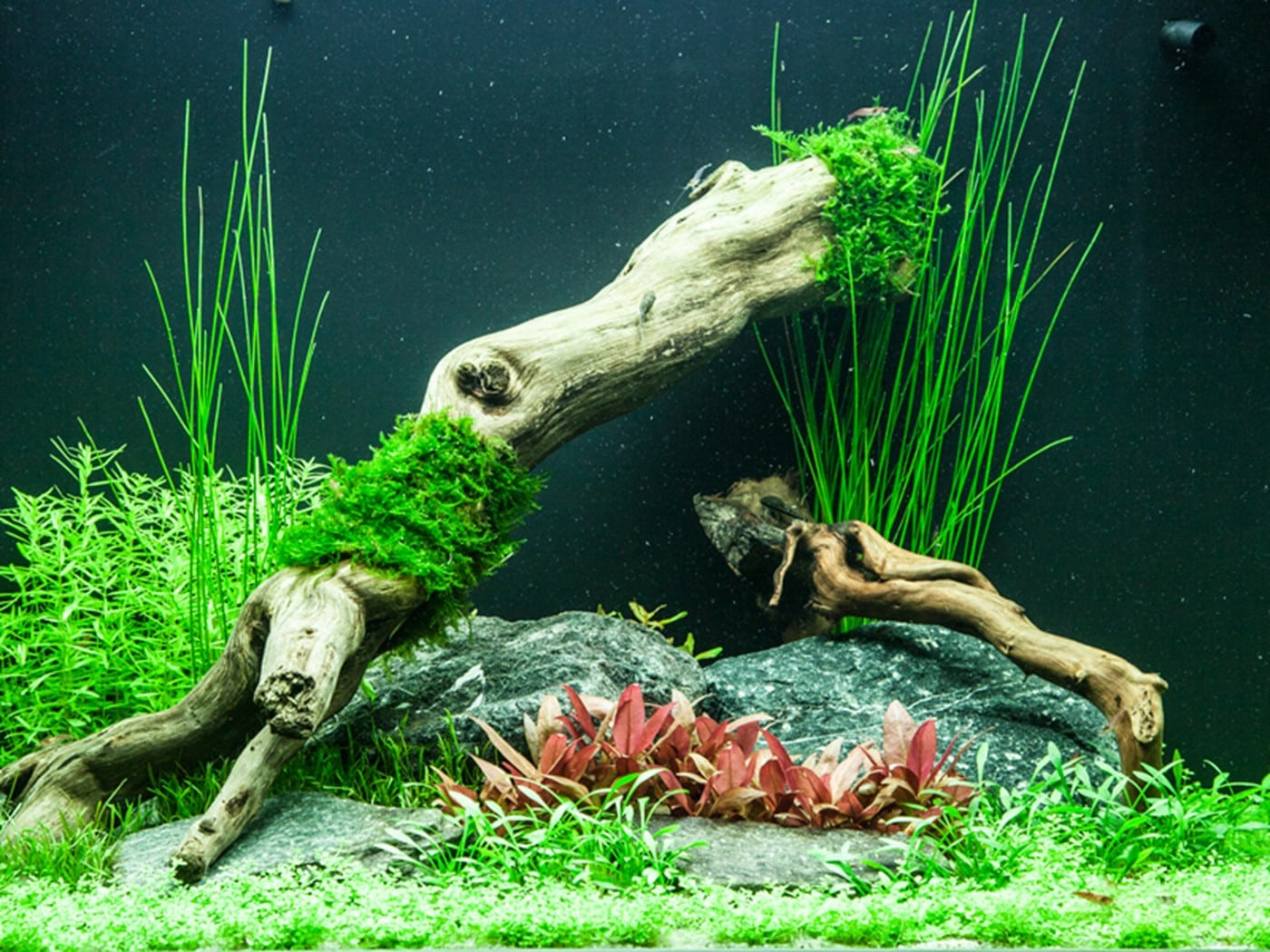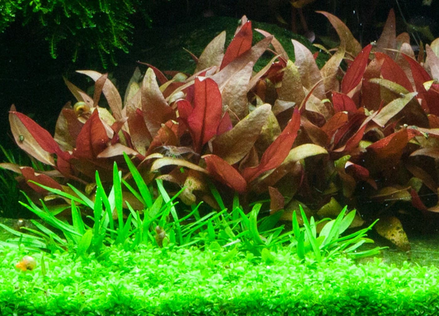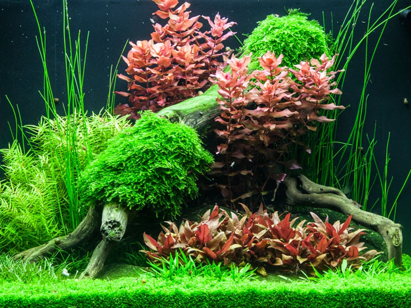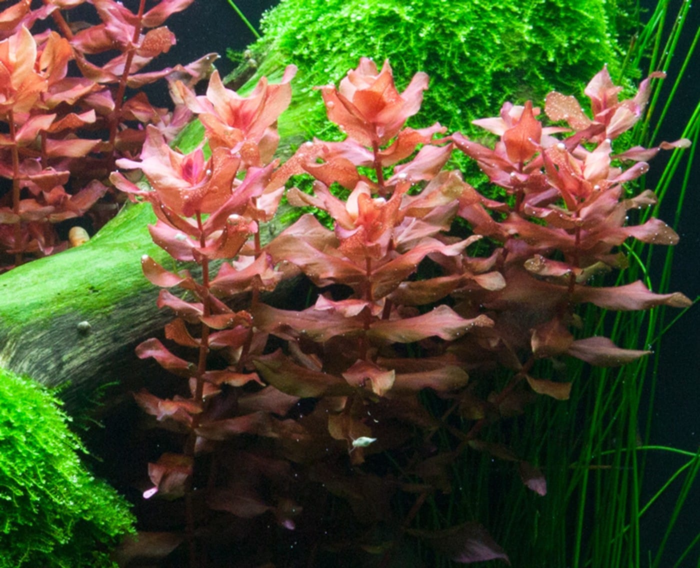 Rote Pflanzengruppen aus Rotala macrandra und Alternanthera ‚Mini‘ sind der Blickfang zwischen den verschiedenen Grüntönen. Eine Nahaufnahme von Rotala macrandra sehen Sie im Video. Die zentrale Holzwurzel mit aufgebundenem Christmas-Moos verleiht dem Aquarium einen Hauch von Alter, während der frischgrüne Teppich aus Cuba-Hemianthus einen hellen und freundlichen Eindruck vermittelt. Lilaeopsis und Cryptocoryne parva wurden hier eingesetzt, um einen Übergang zwischen der zentralen Insel und dem Pflanzenteppich im Vordergrund zu schaffen. Die dunkleren grünen Blätter von Lilaeopsis und Cryptocoryne parva kontrastieren beide sehr schön zum hellgrünen Hemianthus.