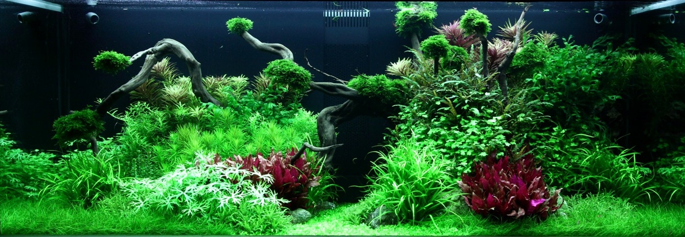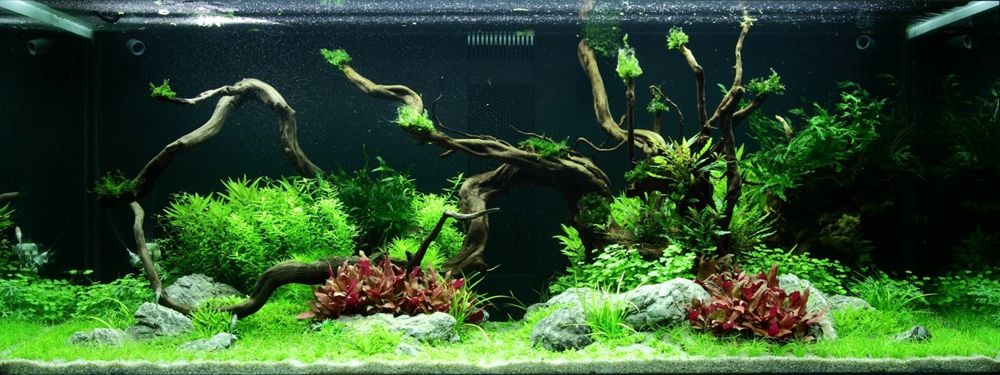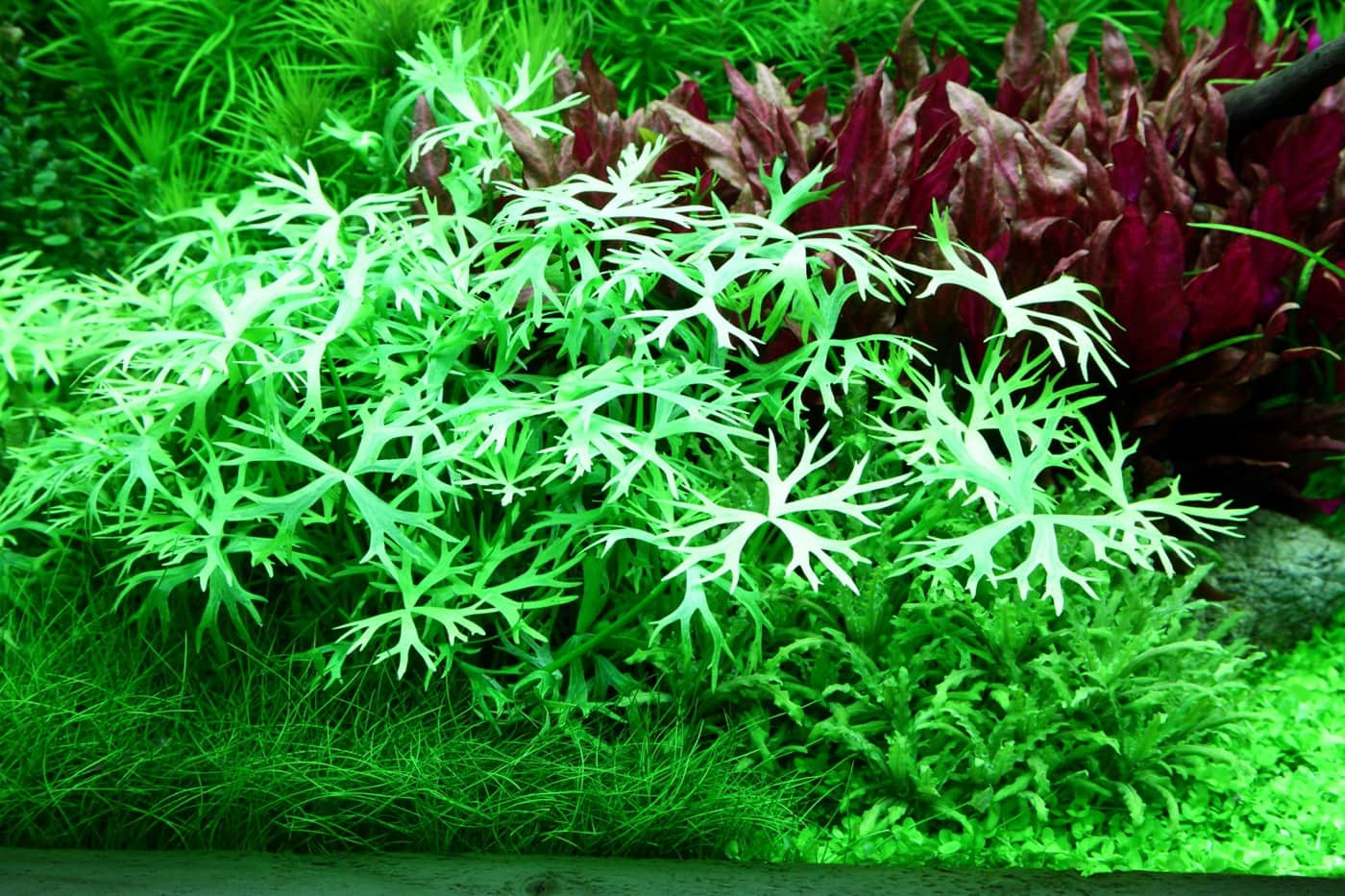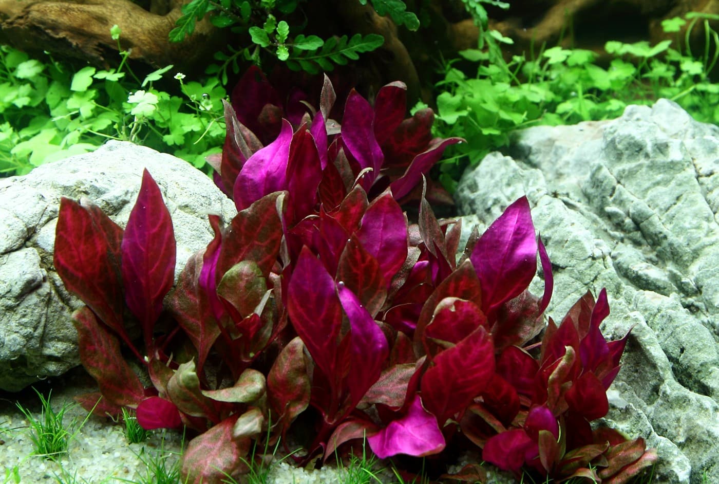 Das kräftige Pink der Alternanthera ‚Rosanervig‘ wird sehr schön von der Limnophila hippuridoides darüber wieder aufgenommen.