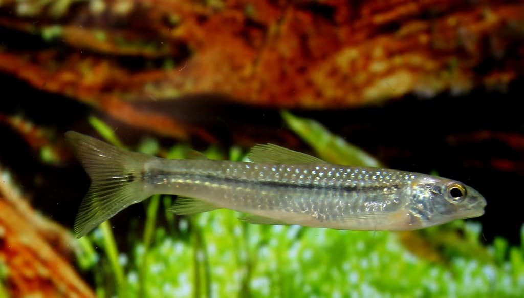 Von dieser Art fanden wir zwei Exemplare in einem Becken mit Algensalmlern. Sie halten sich vorwiegend am Boden auf und suchen offensichtlich die Gesellschaft des anderen. Ihre Färbung ist auf dem zweiten Bild gut zu erkennen: Ihre Körperseite ziert ein durchgängiger schwarzer Streifen durch den einzelne Längsstreifen verlaufen.