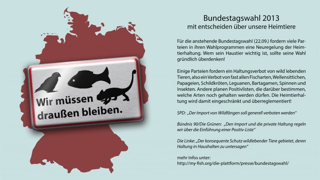 Für die anstehende Bundestagswahl am 22. September fordern viele Parteien in ihren Wahlprogrammen eine Neuregelung der Heimtierhaltung. Einige Parteien fordern ein Haltungsverbot von wild lebenden Tieren, also ein Verbot von fast allen Fischarten, Wellensittichen, Papageien, Schildkröten, Leguanen, Bartagamen, Spinnen und Insekten. Andere planen Positivlisten, die darüber bestimmen, welche Arten noch gehalten werden dürfen.