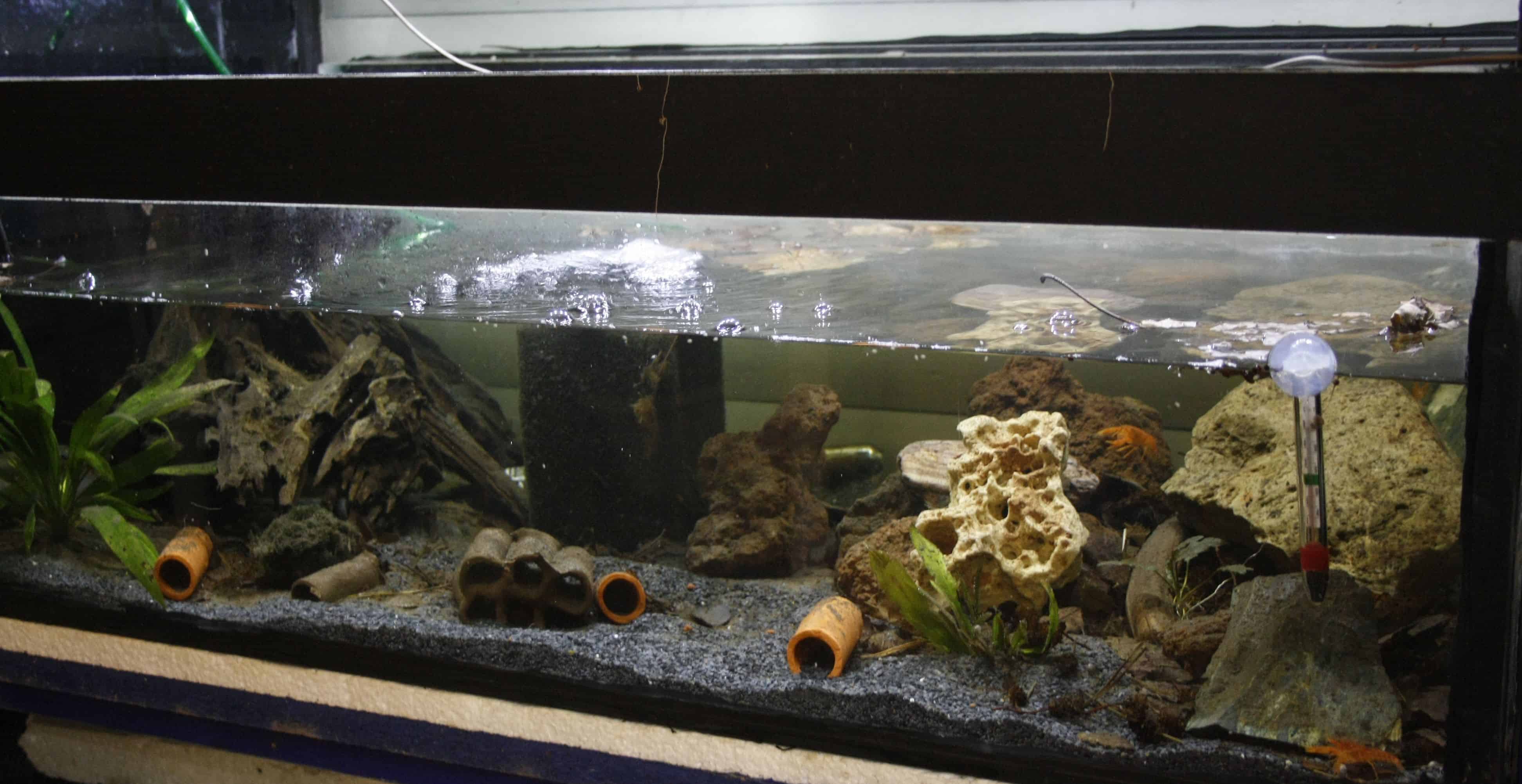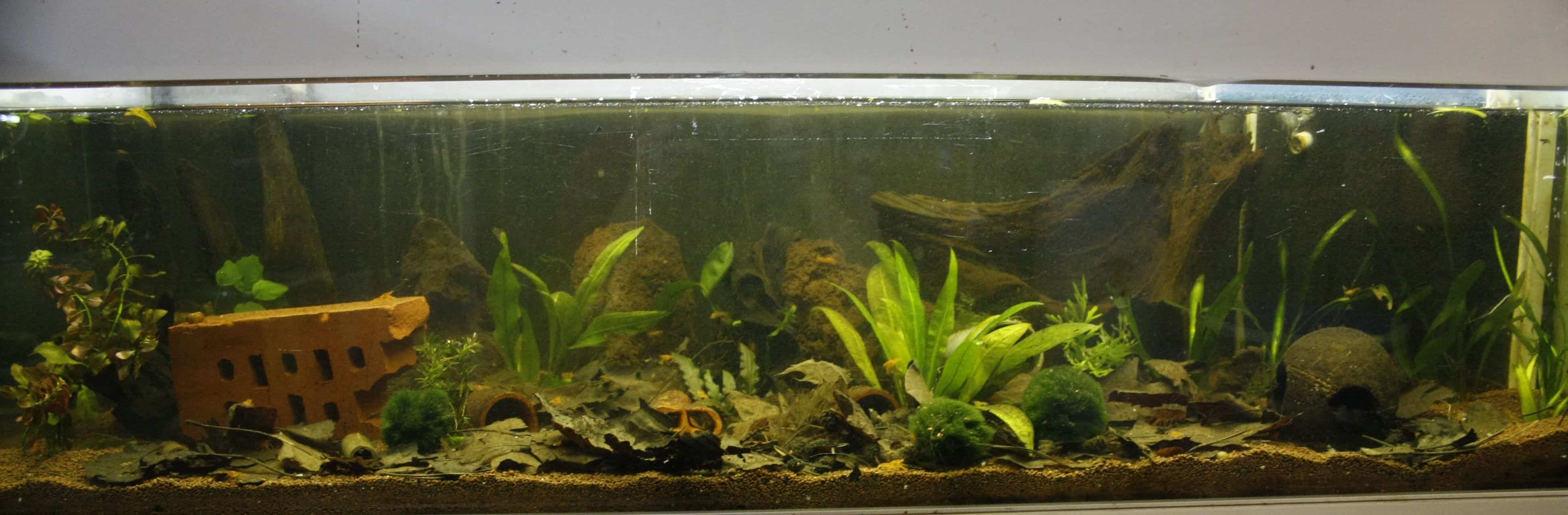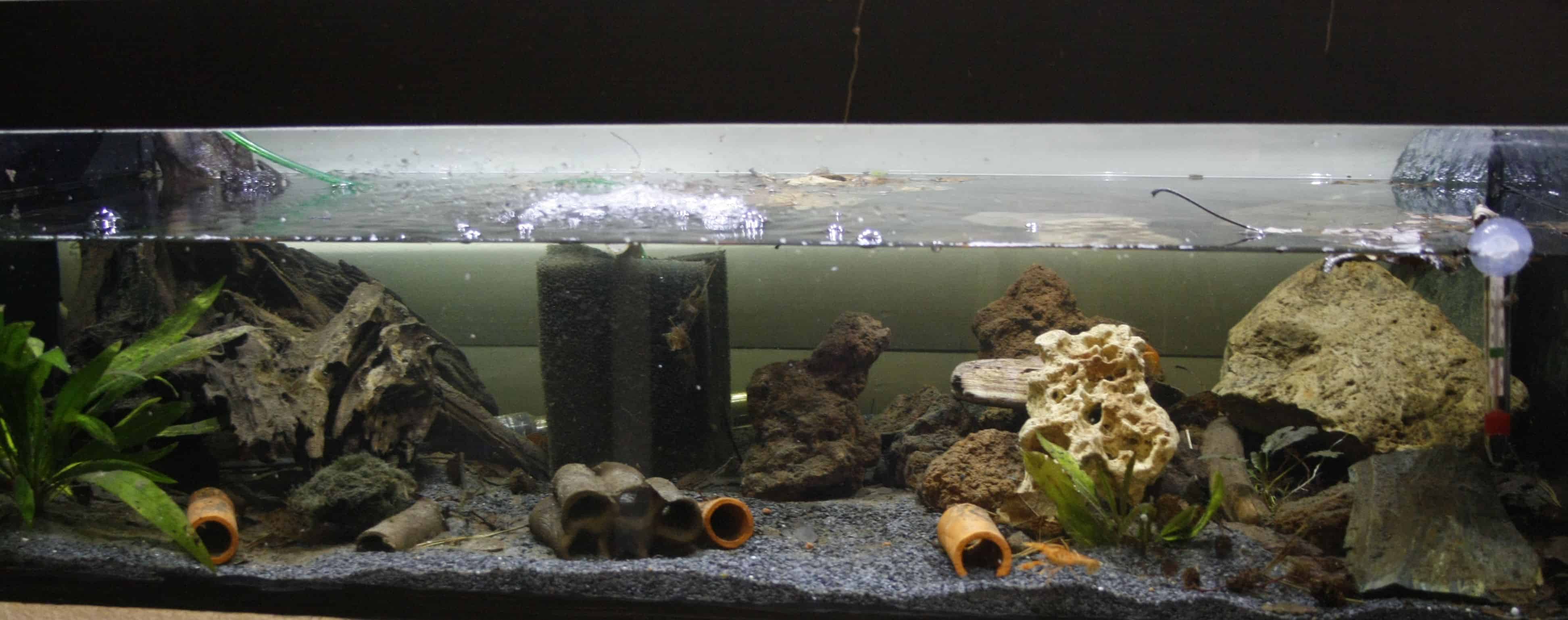 Ich habe ein Becken für die adulten Zuchttiere mit den Maßen 1,00 M breit und 0,50 tief. So haben die Tiere eine große Grundfläche. Das Aufwuchs Becken hat die Maße 1,20 M breit und 0,40 tief. Im Aufwuchs Becken wachsen zur Zeit drei Würfe heran. Einrichtung ist in beiden Becken identisch: Steinaufbauten und Holzaufbauten, in denen sich kleine Hohlräume als Verstecke befinden. Zahlreiche nach beiden Seiten offene Tonröhren und einige robuste Pflanzen Mengen an Laub