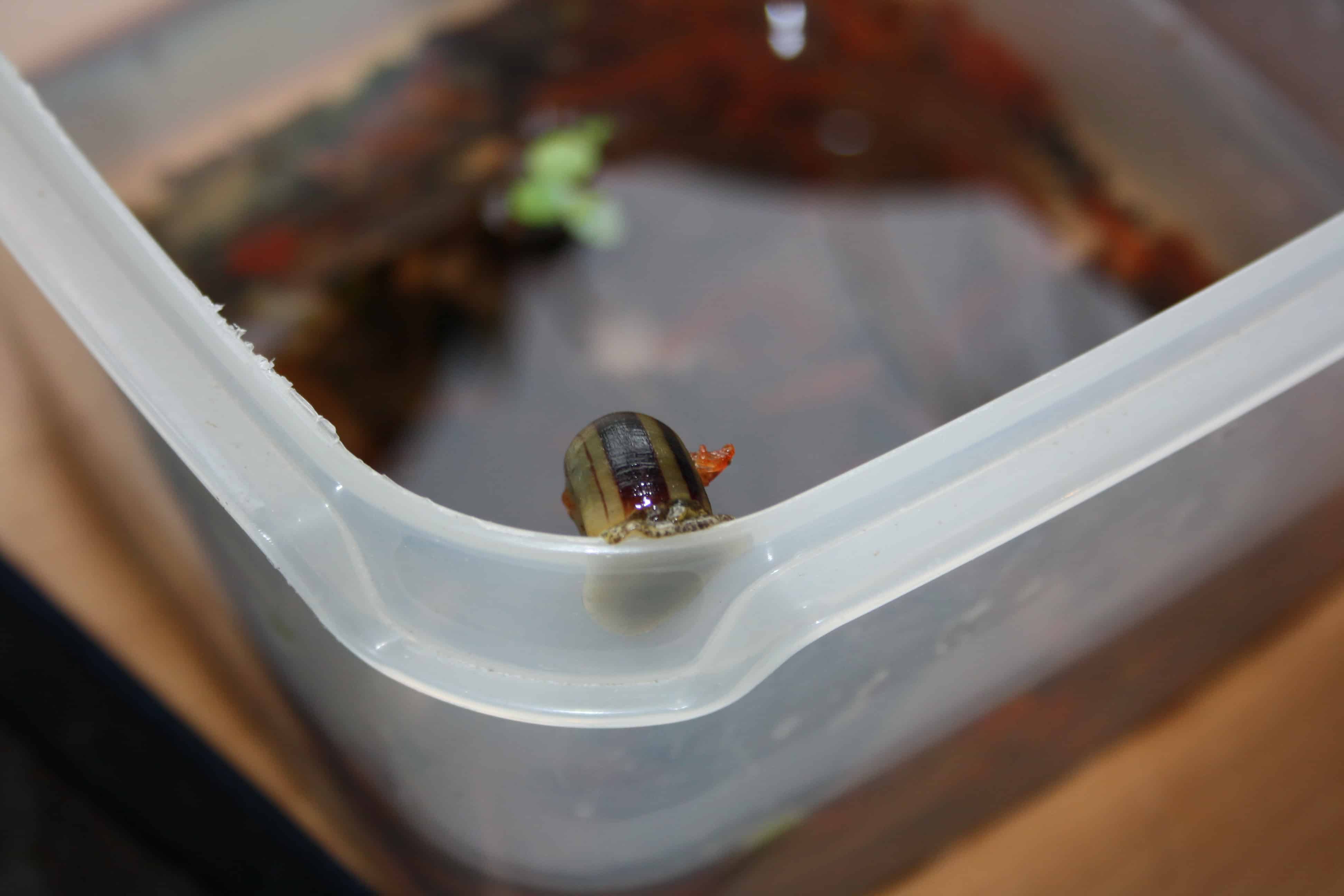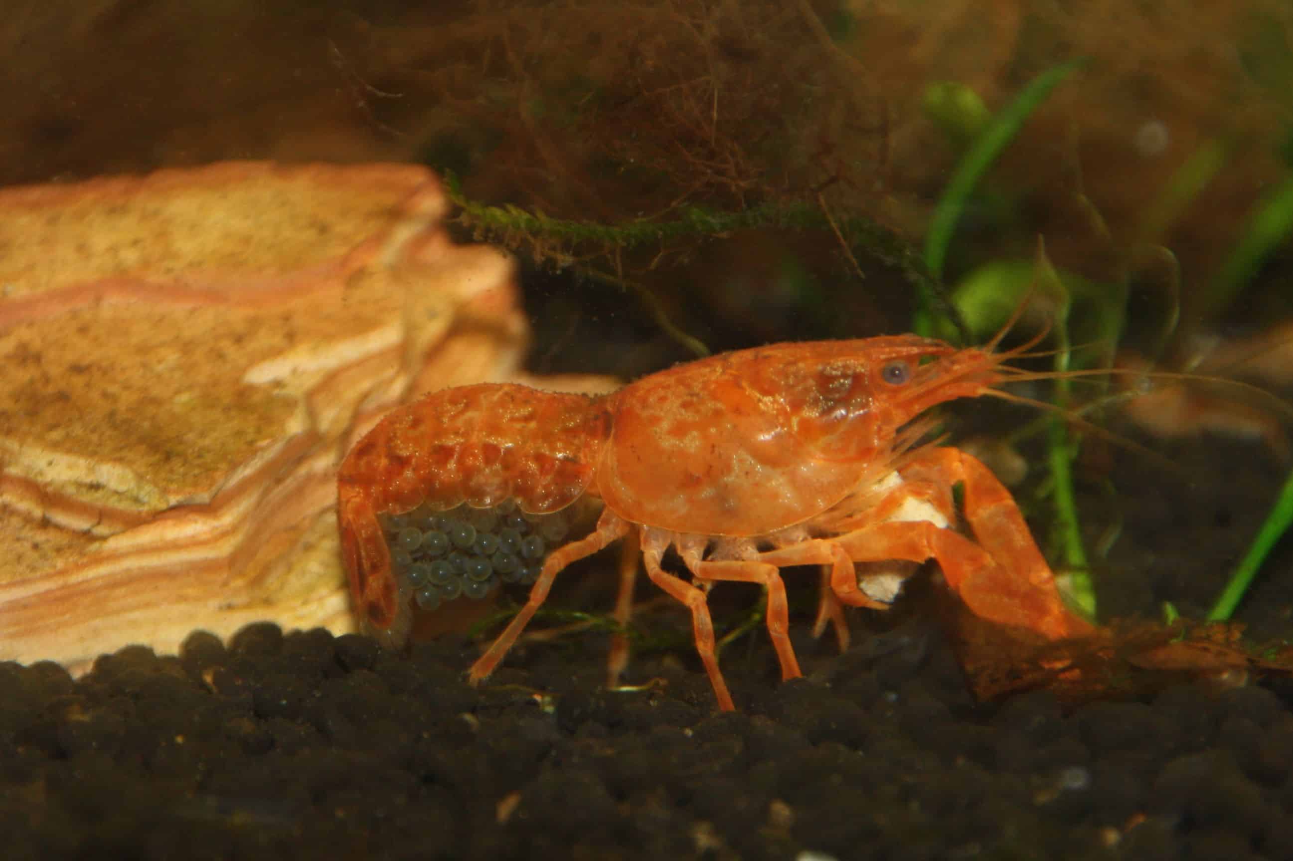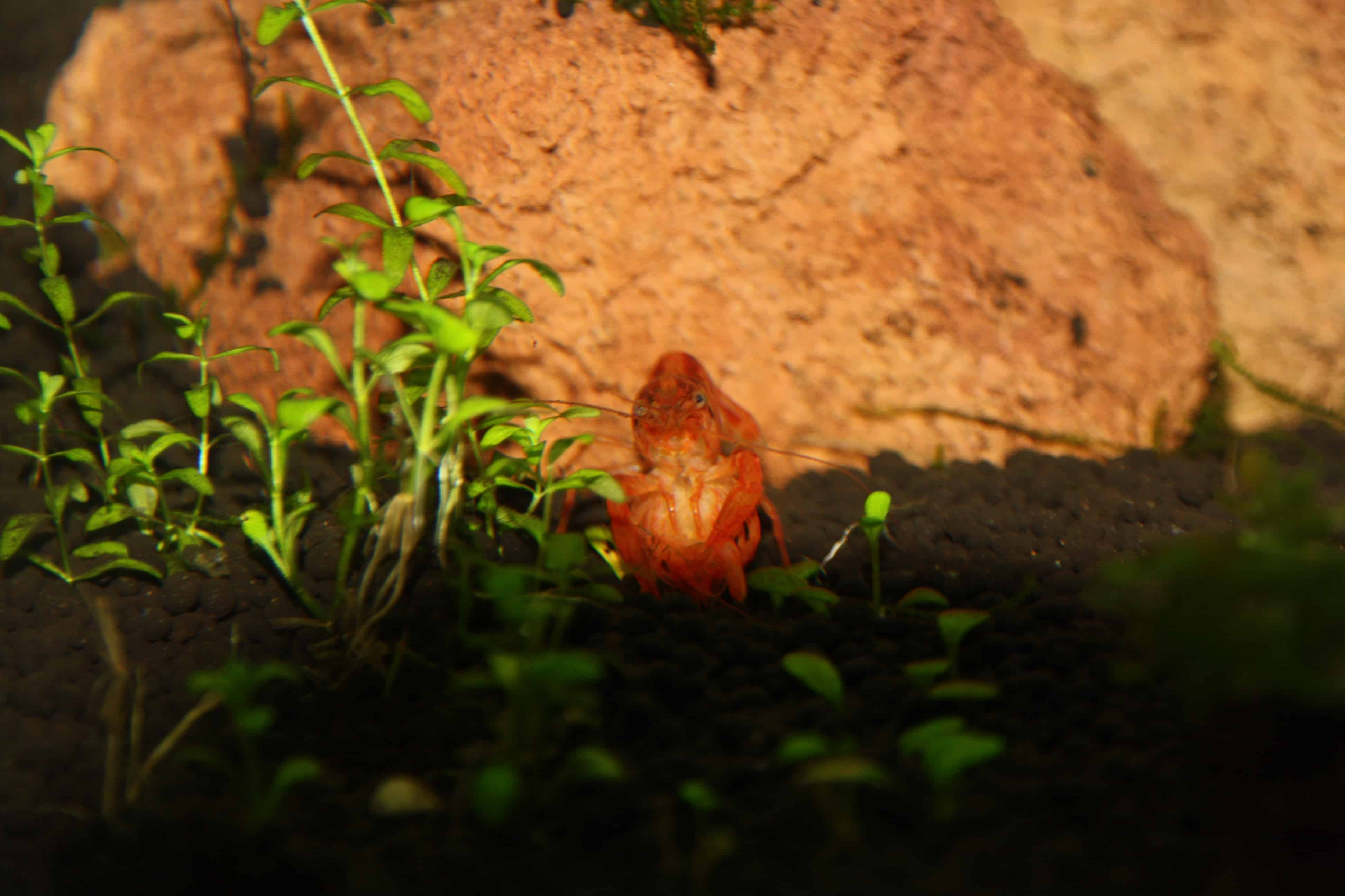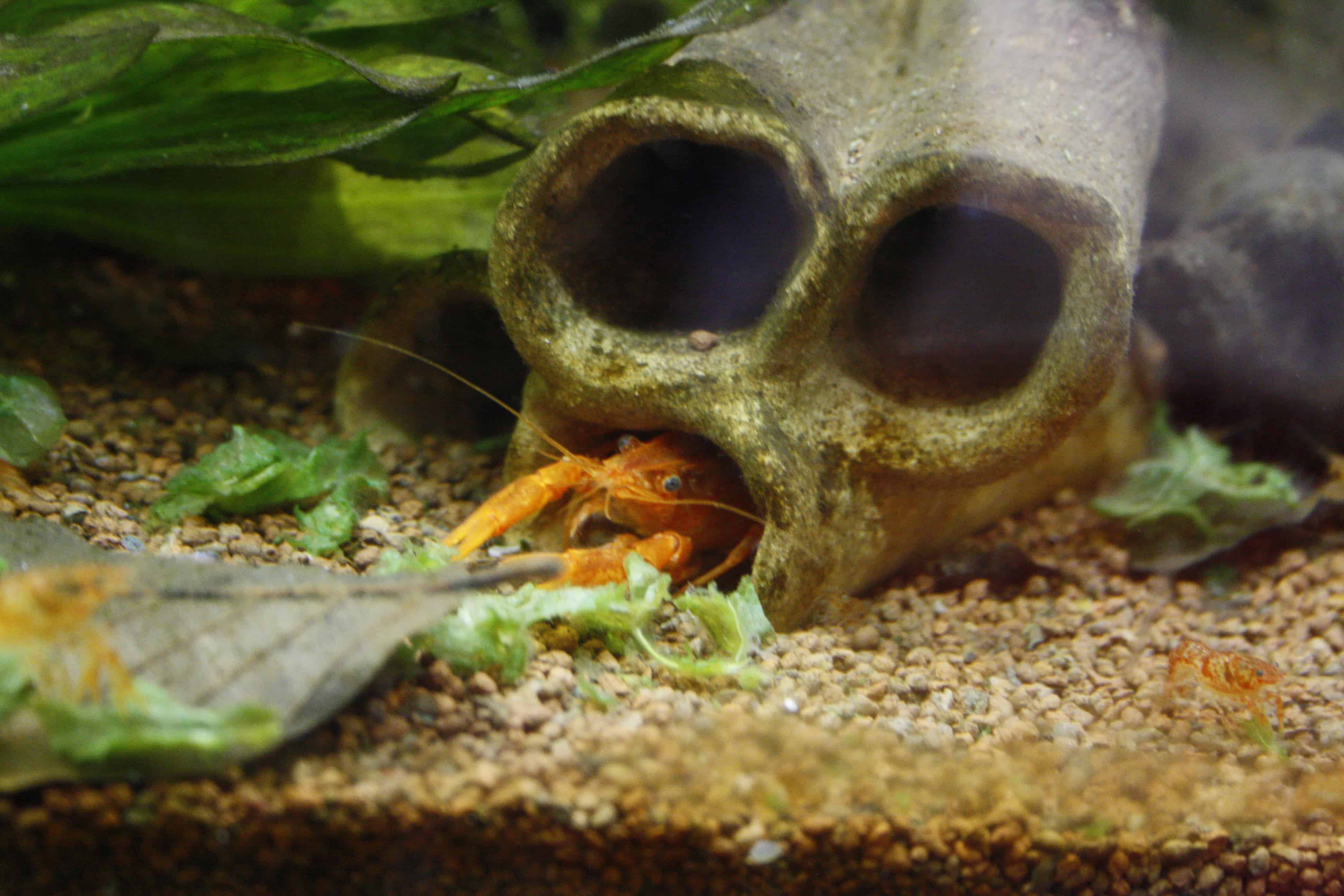 Ich habe ein Becken für die adulten Zuchttiere mit den Maßen 1,00 M breit und 0,50 tief. So haben die Tiere eine große Grundfläche. Das Aufwuchs Becken hat die Maße 1,20 M breit und 0,40 tief. Im Aufwuchs Becken wachsen zur Zeit drei Würfe heran. Einrichtung ist in beiden Becken identisch: Steinaufbauten und Holzaufbauten, in denen sich kleine Hohlräume als Verstecke befinden. Zahlreiche nach beiden Seiten offene Tonröhren und einige robuste Pflanzen Mengen an Laub