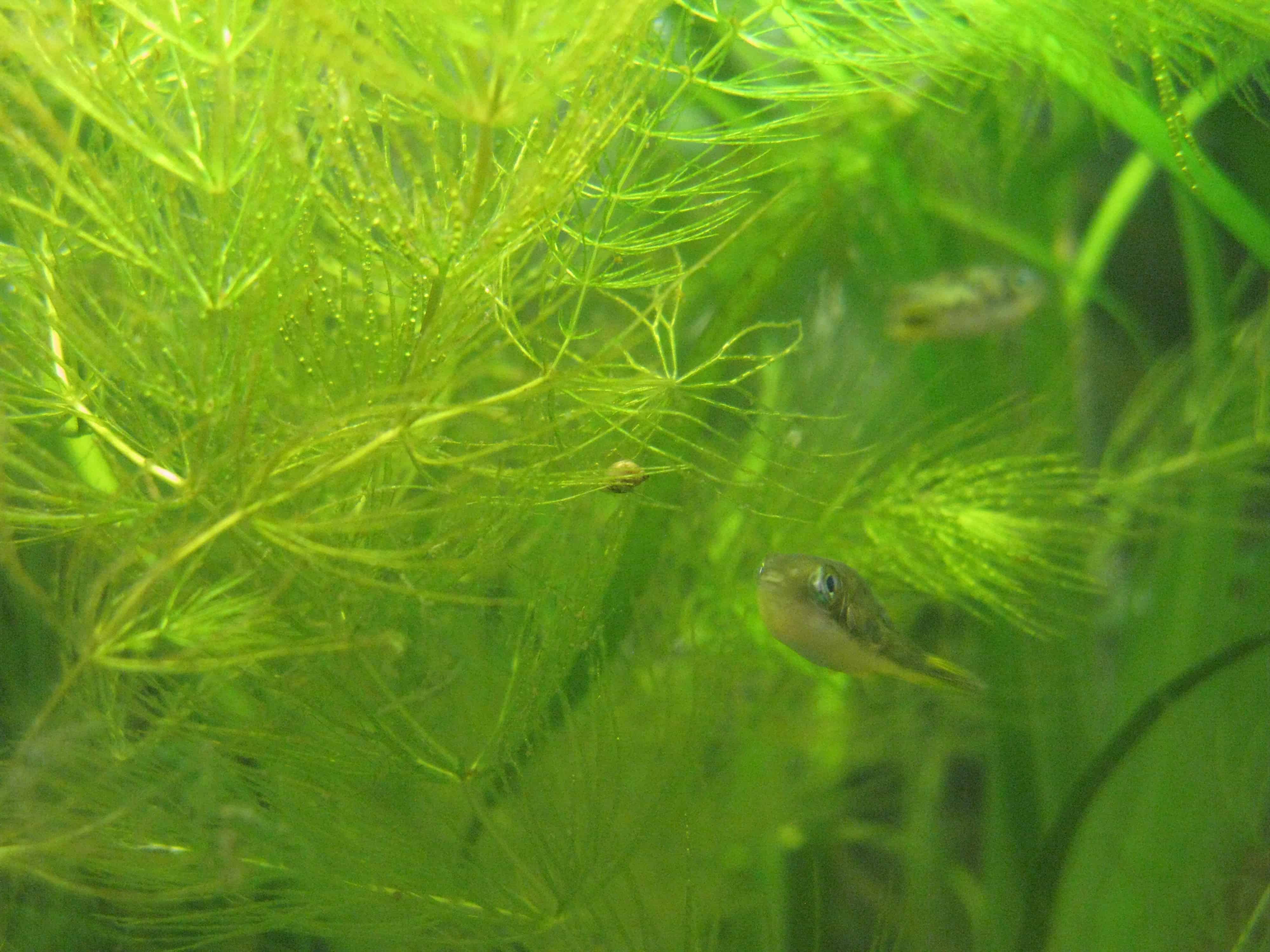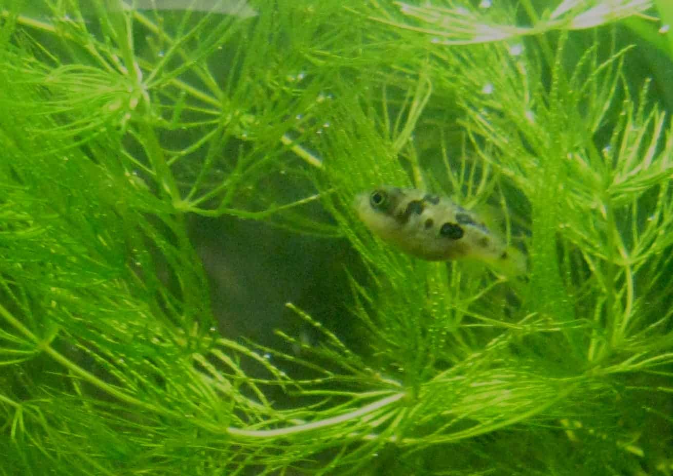 Alle Schnecken, die sich noch im Becken befanden sind mittlerweile aufgefressen worden. Seit gestern gebe ich über den Tag verteilt ca. 60 kleine Schnecken (Blasenschnecken und Posthörnchen) mit je einer Größe von ca. 2 bis 5mm ins Becken, diese werden innerhalb kürzester Zeit komplett aufgefressen. Soweit ich gesehen habe, haben alle Kugelfische genug Schnecken abbekommen. Die Kugelfische schwimmen verteilt durch das Aquarium, halten sich aber auch sehr gerne zwischen dem Hornkraut auf.