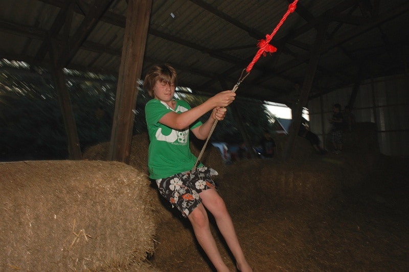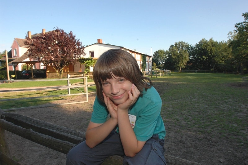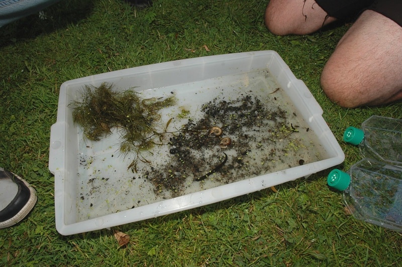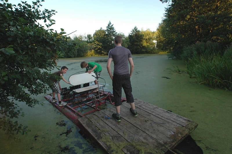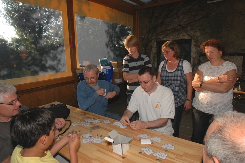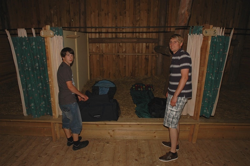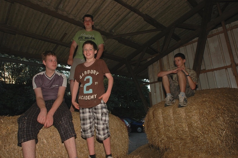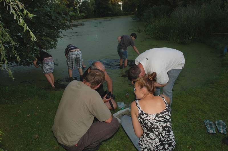 „Nachdem die Anfahrt etwas problematisch war, da einige Gruppen im Stau standen, konnten am Abend die Quartiere – es standen Schlafplätze im Heu und Campen als Alternative zur Verfügung – bezogen werden. Am Abend gab es eine kurze Besprechung der Betreuer für der nächsten Tage und dann standen die restlichen Tagesstunden zur freien Verfügung. Beim Toben im Stroh lernten sich die Kids kennen aber als ein paar der Teilnehmer anfingen, den auf dem Grundstück gelegenen Teich mit Floss und Tretboot zu erkunden, gab es keine Halten mehr. So konnten schon am ersten Abend viele Wasserwanzen, Egel und Molchlarven gekeschert und fotografiert werden. Erst lang nach dem Dunkelwerden kehrte dann Ruhe ein.“