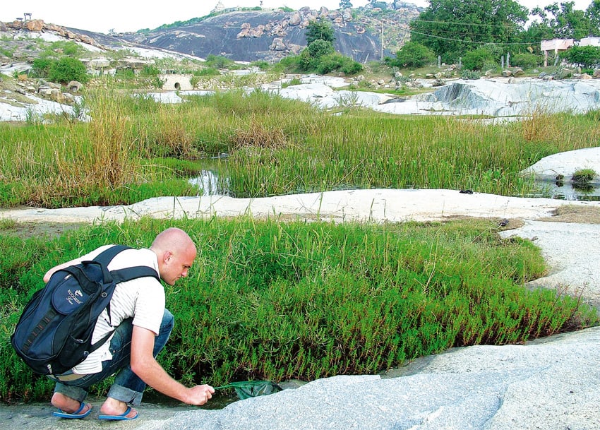 Im Jahr 2009 hatte ich zum ersten Mal die Gelegenheit, die Gegenden von Belur und Halebid im südindischen Bundesstaat Karnataka zu bereisen und auch ichthyologisch ein wenig zu untersuchen. In diesem Gebiet gibt es zum einen fantastische Tempel mit unglaublichen Steinmetzarbeiten, zum anderen aber auch sehr viele kleine Tümpel und Teiche. Diese sind oft dicht mit Pflanzen bewachsen. In der Monsunzeit schwellen sie zu großen flachen Seen an; in der Trockenzeit bleiben meist nur sehr flache und kleine Wasserlöcher bestehen – ein extremes Habitat für Fische und andere wasserlebende Tiere. Die Gegend ist meist landwirtschaftlich geprägt und die meisten dieser Gewässer befinden sich in der Kulturlandschaft. Ich denke, dass diese Tümpel und Teiche oft auch vom Pestizideinsatz betroffen sind. Aus diesen Gründen habe ich eigentlich keine aufregenden Funde erwartet. Zu meinem Glück sollte ich mich jedoch täuschen. Ich möchte hier über einen kleinen Teich berichten, den ich im Verlauf von drei Jahren in den verschiedenen Jahreszeiten mehrfach be- und untersucht habe. Dieses kleine stehende Gewässer befindet sich in der Umgebung von Belur auf einer leichten Anhöhe in einer Felsformation aus Granit. Es handelt sich um ein permanentes, also nicht ausvon Benjamin Harink trocknendes Gewässer…