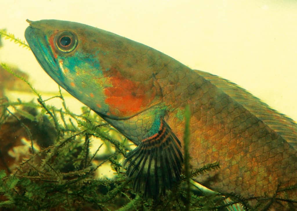 das Netz nun sehr schnell über den Steinboden und rammte es in die Uferpflanzen. Für diese netzzerstörende und anstrengende Methode wurde ich jedoch königlich entlohnt. Nachdem ich die Pflanzen aus dem Netz entfernt hatte, zappelte ein kleines Exemplar von Channa gachua im Netz. Nun war mein Fangeifer wieder geweckt und ich fing mit dieser Methode einige Individuen mehr, unter anderem ein relativ großes Tier (ca. 15cm). Die Channa gachua aus diesem Teich zeichnen sich durch eine fantastische Rot- und Blaufärbung aus. Die Rotfärbung hält sich auch bei gestressten Fischen sehr gut. Die interessantesten Zeichnungselemente sind sicher die neon-orangen Pünktchen auf der Kehle. Diese werden von allen adulten Tieren dieser Population ausgebildet. Jungtiere sind oft mit vielen kleinen schwarzen Pünktchen übersäht. Die Pflege im Aquarium gestaltete sich einfach – wie bei anderen Channa-Arten wurde jedes Futter gefressen. Ein Problem stellt allerdings die extreme Aggressivität dieser Art dar. Man kann ihr begegnen, indem man das Aquarium extrem dicht bepflanzt und mit vielen Versteckplätzen, vor allem auch in Oberflächennähe, einrichtet. Als Luftatmer benötigen Channa freien Zugang zur Wasseroberfläche. Wird dieser vom dominierenden Tier für alle anderen unterdrückt, kann es zu Ausfällen kommen. Das Aquarium muss für diese Art gut abgedeckt sein, ansonsten endet es mit Trockenfisch vor dem Aquarium. In dem von mir untersuchten Teich standen die Channa als größter Räuber am Ende der Nahrungskette. In einem Jahr konnte ich in diesem Teich eine Population von Oreochromis niloticus beobachten, die wahrscheinlich als Speisefische eingesetzt wurden. Zum Glück konnte ich nach der heißen und trockenen Jahreszeit diese Art nicht mehr finden. Anscheinend hatten sie die hohen Temperaturen mit dem verbundenen Sauerstoffmangel nicht überlebt. Channa gachua kommt in diesem Teich in extrem hoher Dichte vor, pro Quadratmeter schätze ich mehr als zehn Exemplare. Der Großteil dieser Fische misst jedoch weniger als 5 cm. Interessant ist auch, dass sie zwar das gesamte Jahr über zu brüten scheinen, jedoch verstärkt in der heißen und trockenen