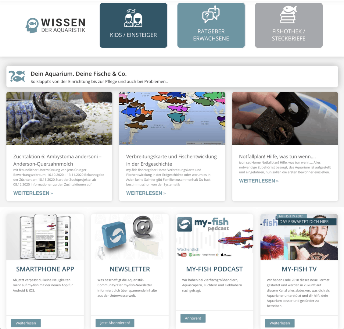 Eine Seite rund um die Aquaristik – hier findet man alles vom Einstieg für den Anfänger bis hin zum Profi, der auf der Suche nach Lösungen für ein spezielles Problem ist – auf dem offenen Portal my-fish.org wird jeder fündig. Und das Besondere daran ist, dass jeder mitmachen kann und seine Erfahrungen mit anderen Lesern teilen kann. Nicht umsonst bietet das seit 2010 bestehende Portal aktuell mehr als 2.180 Steckbriefe, 2.610 Blogbeiträge und über 570 Ratgeber-Wissensseiten. Jährlich kommen 312 Blogbeiträge und 730 Social Media Posts hinzu, neben den beliebten my-fish TV Videos und dem Podcast. Hier bekommst du nicht nur einen Einblick in die Aquariumszene, sondern auch in spezielle Themen und Trends rund um die Aquaristik.