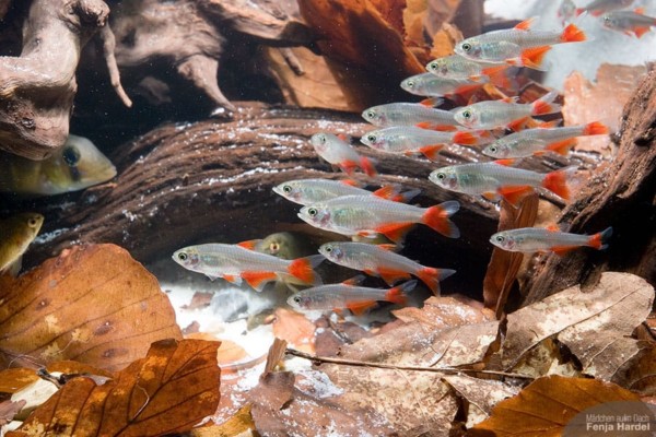 Auch bei der Einrichtung orientiert man sich an der Natur. Liegen Äste und Wurzeln im Gewässer? Laub von welchen Bäumen fällt hinein? Gibt es bestimmtes Gestein, bestimmte Farben, die vorherrschen? Brauchen die gehaltenen Fische Verstecke, Höhlen oder Nischen?
