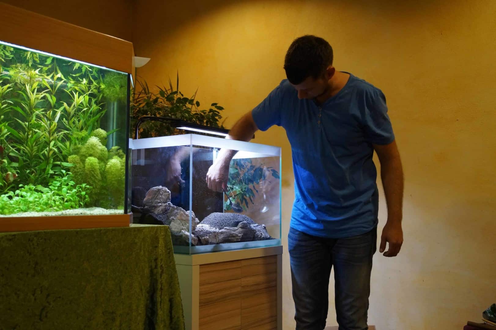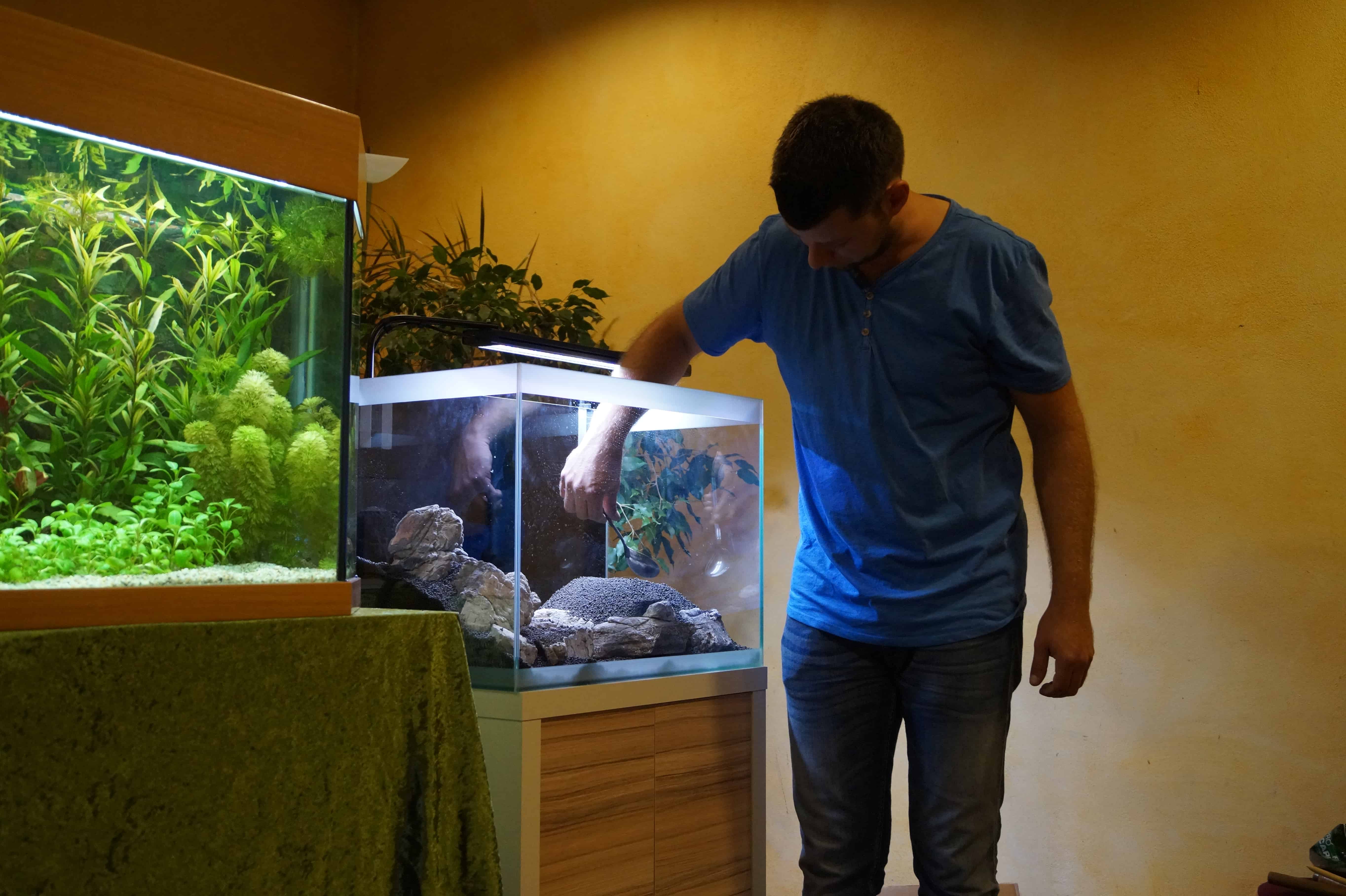 Am Samstag fand zunächst der Aquascaping Workshop statt. Gemeinsam mit Dominik Lenk, einem ortsansässigen Aquascaper, richteten wir zwei schöne Fluval Aquarienkombinationen ein.