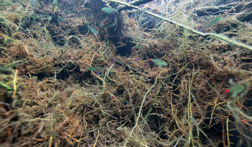 Diese etwas tiefere Uferzone ist auch der Heimatbereich von riesigen Schwärmen der Rotkopfsalmler, Hemigrammus rhodostomus, die hier in der starken Strömung im offenen Wasser nach Kleintieren jagen. Der etwas ruhigere Bereich direkt entlang der Uferwand besteht aus dicht geflochtenen Matten der Baumwurzeln. Hier halten sich die kleineren und etwas langsameren Salmler auf: Paracheirodon axelrodi, Hemigrammus stictus, Nannostomusund einzelne Apistogramma leben in dieser Wand, die eine gute Deckung gegen die Räuber im offenen Wasser bietet.