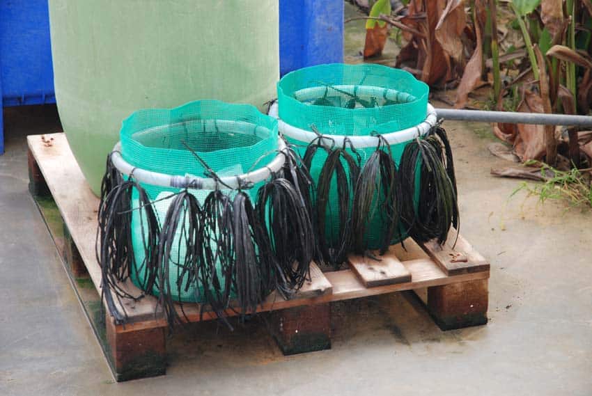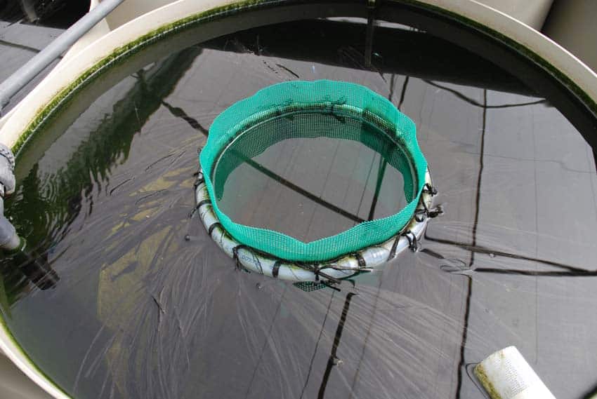Um neue Farbschläge zu erhalten, kreuzt der Züchter verschiedene Tiere verschiedener Farben miteinander. Aus den Nachkommen wählt er diejenigen aus, die dem Endergebnis am nächsten kommen und vermehrt sie weiter. Erst, wenn er die gewünschte Farbe erhalten hat, geht es an die Körperform: dann werden nur noch Tiere weitervermehrt, die die idealen Maße eines Guppys aufweisen. Unser Foto zeigt eine Gruppe Nachkommen, von denen viele Tiere zwar eine ansehnliche Größe und runde Bäuche haben, jedoch farblos sind. Aus diesen wird der Züchter nur diejenigen auswählen, die ein kräftiges Orange zeigen. Die Vermehrung für den Verkauf sieht folgendermaßen aus: Die Elterntiere werden in einem Rundstrombecken gehalten. Durch die kreisende Strömung werden Kot und Futterreste in die Mitte des Beckens gespült, von der sie automatisch abgesaugt werden. An der Oberfläche ist ein Korb mit groben Maschen und Büscheln von Plastikstreifen befestigt. Dieser dient den Jungtieren, die nach der Geburt schon sehr vital sind, als Schutz. Um nicht von den Alttieren gefressen zu werden, verstecken sie sich zwischen den Plastikstreifen und finden so den Weg in das sichere Innere des Korbes. Dieser wird mehrmals täglich abgefischt. Die Jungtiere werden gezählt und in einen eigenen Tank umgesetzt, in dem sie aufwachsen können. Zu jeder neuen Woche wird ein neuer Tank besetzt, sodass Alter und Größe von Reihe zu Reihe steigt. Ist die Verkaufsgröße erreicht, werden die Tiere aus dem jeweiligen Tank abverkauft, sodass dieser für neue Jungfische vorbereitet werden kann.