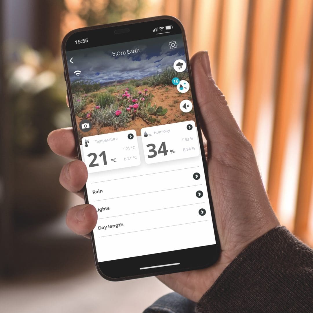 Auch das smarte Terrarium biOrb EARTH, das jüngst mit dem iF product Design Award, einem der wichtigsten Designpreise, ausgezeichnet wurde, ist vollständig steuerbar. Licht, Sound, Nebel oder Regen können über die OASE Control App individuell eingestellt werden.