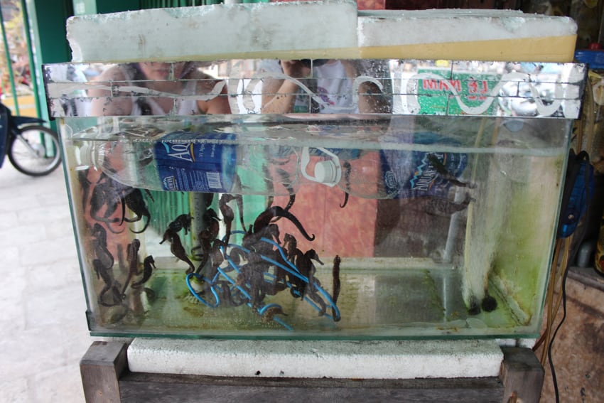 Als wir schließlich beim vierten Tauchplatz wieder runter wollten, hieß es plötzlich, dass es keinen weiteren Tauchgang mehr geben würde, da das Boot bis 17 Uhr wieder im Hafen sein musste, um keine Strafe zahlen zu müssen. Natürlich waren wir alle enttäuscht, auch weil wir nicht verstehen konnten, warum die Vietnamesen das nicht vorher erwähnt haben. Doch dies hatte auch etwas Gutes, denn so konnte ich mit noch mit den anderen ein wenig die Stadt erkunden und skurrile Dinge, wie haufenweise eingelegte Echsen, Schlangen, Muscheln und Seepferde entdecken.