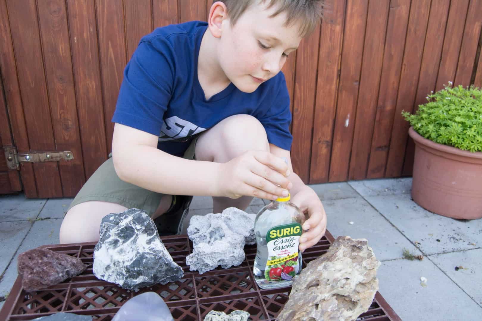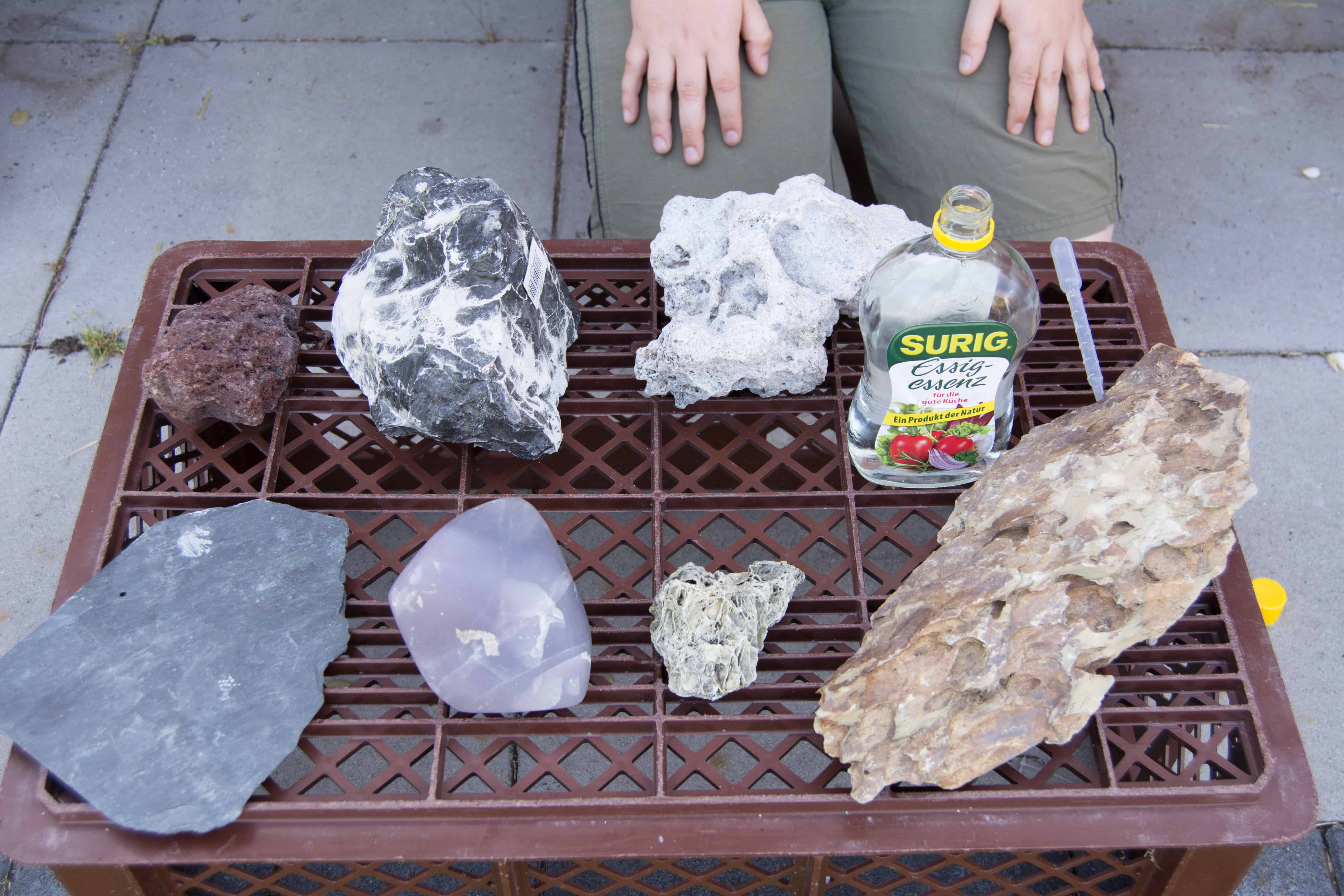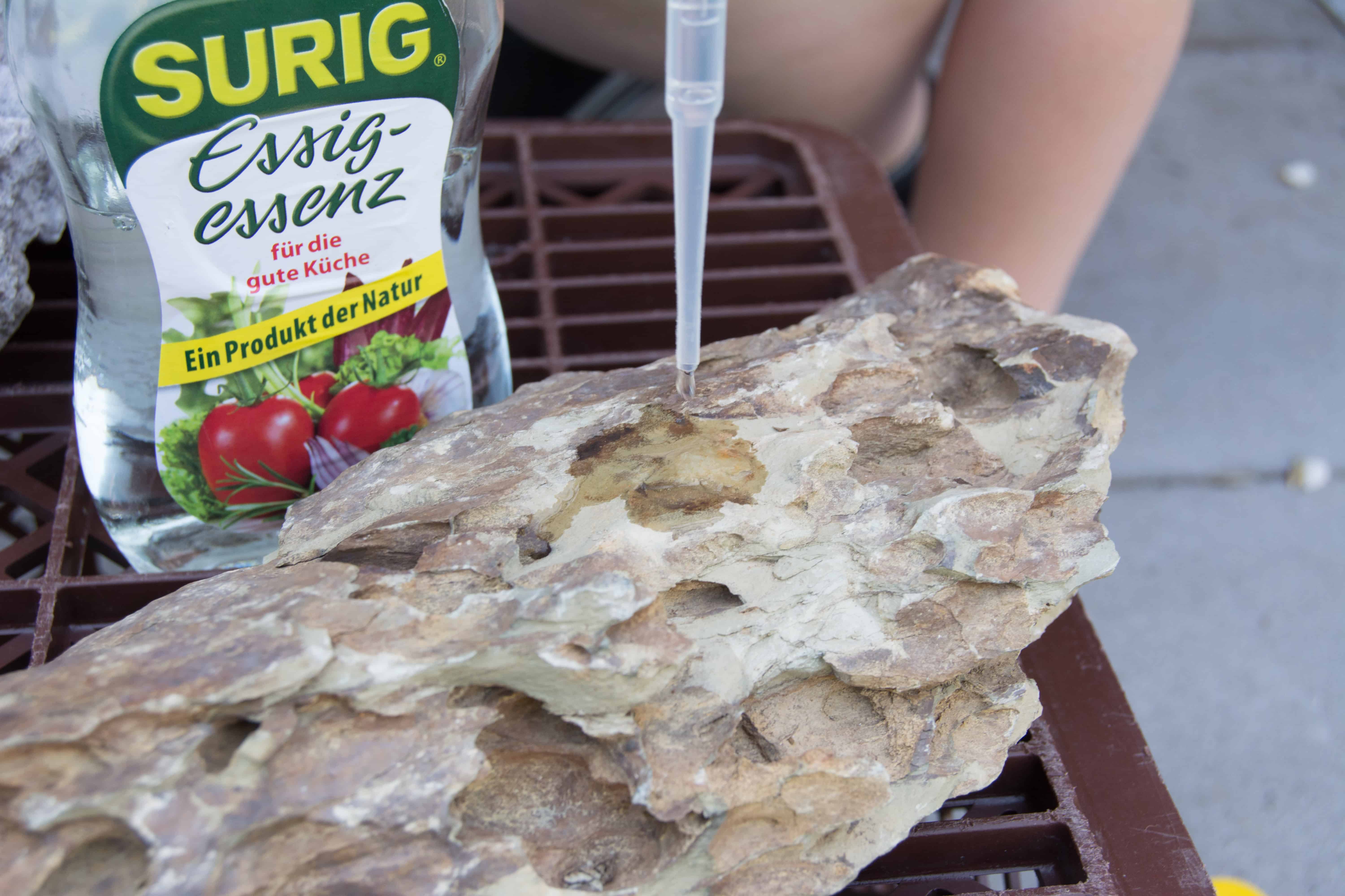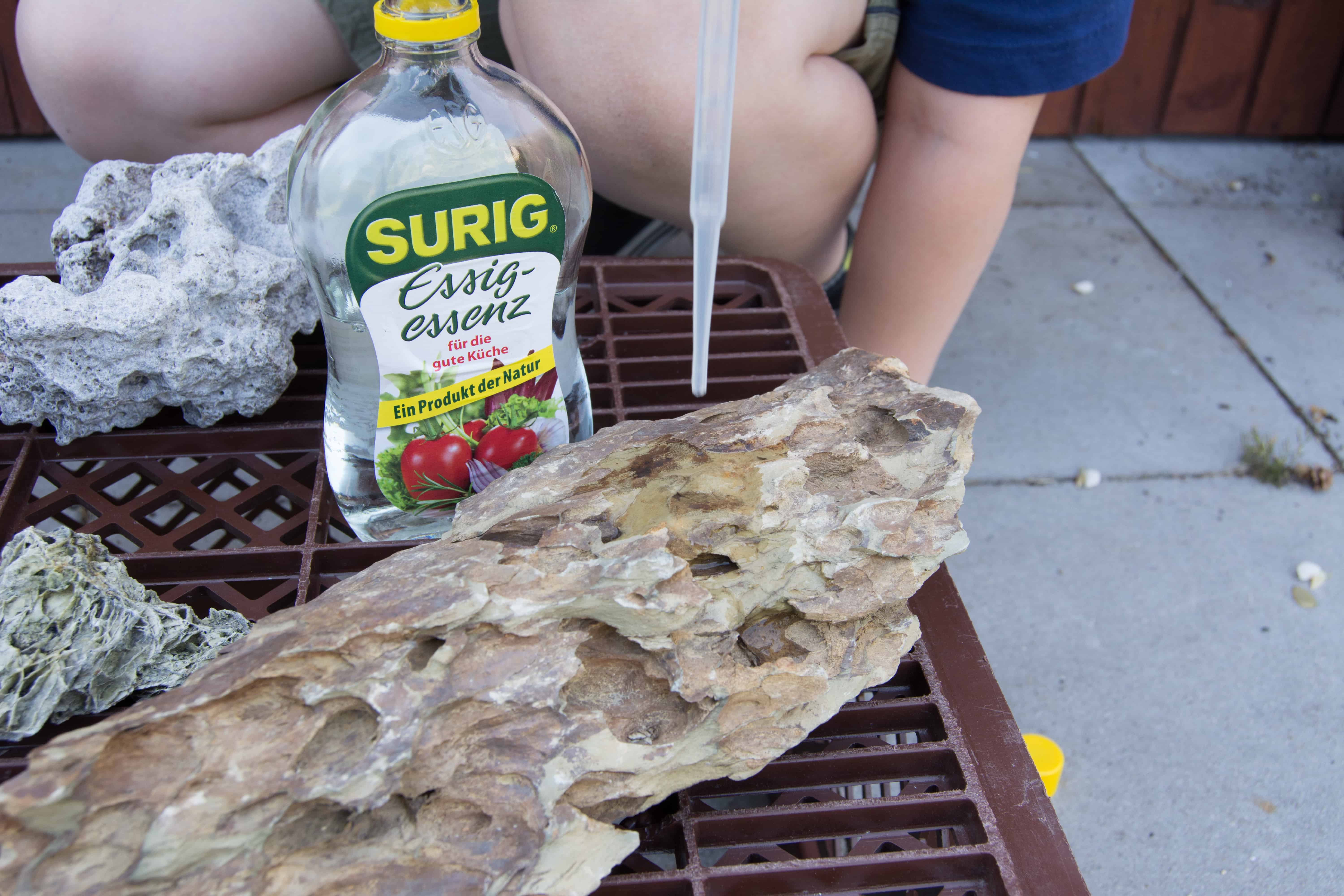 Ob die Steine, die du verwenden möchtest, Kalk enthalten, kannst du ganz leicht mit einem Test herausfinden. Den Test kannst du bei gekauften aber auch bei gesammelten Steinen zur Kontrolle machen. Du solltest den Versuch gemeinsam mit deinen Eltern machen.
