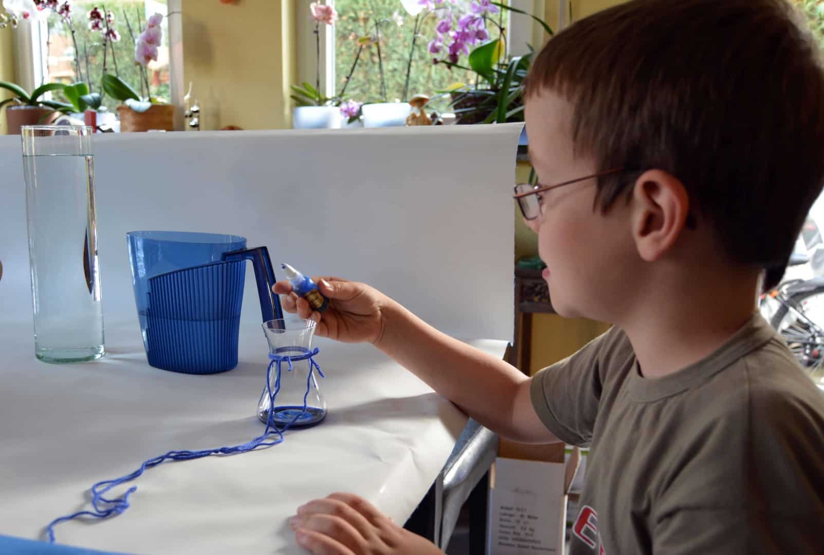 Fülle nun das große Gefäß mit kaltem Wasser – mache es nicht zu voll, sonst schwappt es über. Tropfe anschließend ein wenig Tinte oder Wasserfarbe in das kleine Glas und fülle es dann bis fast unter den Rand mit warmem Wasser auf.