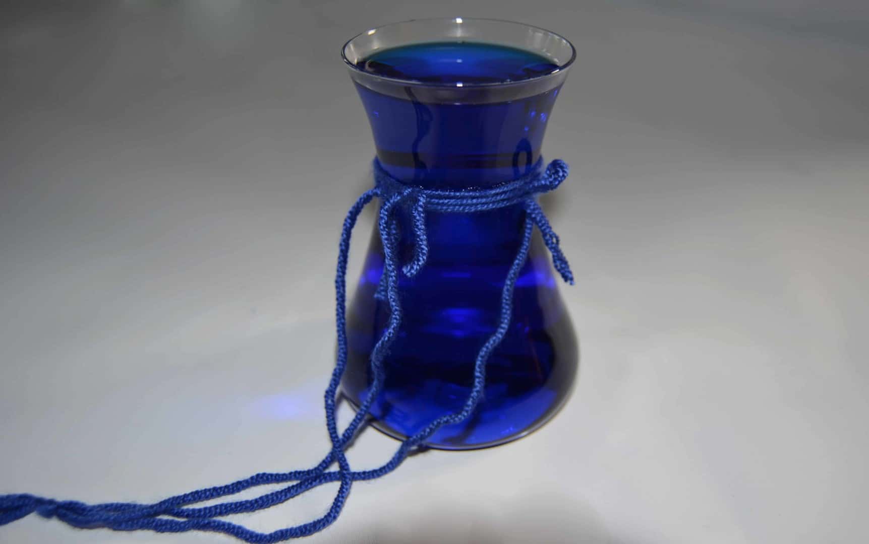 Binde drei Wollfäden oder andere Schnüre an das kleine Glas und verknote die Fäden so, dass sie frei und gerade hängen, sie sollten aber nicht bis zum Boden der Vase reichen.
