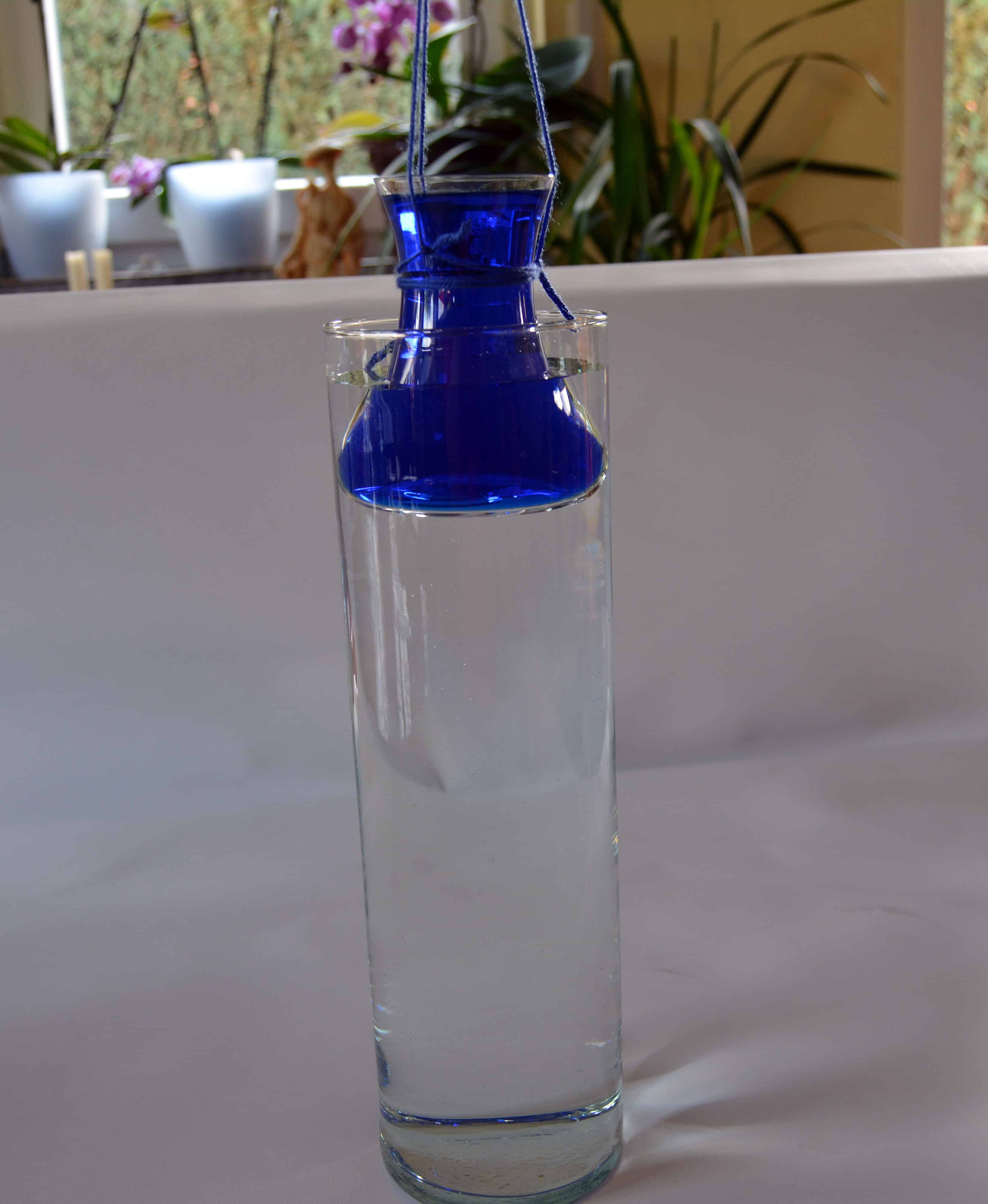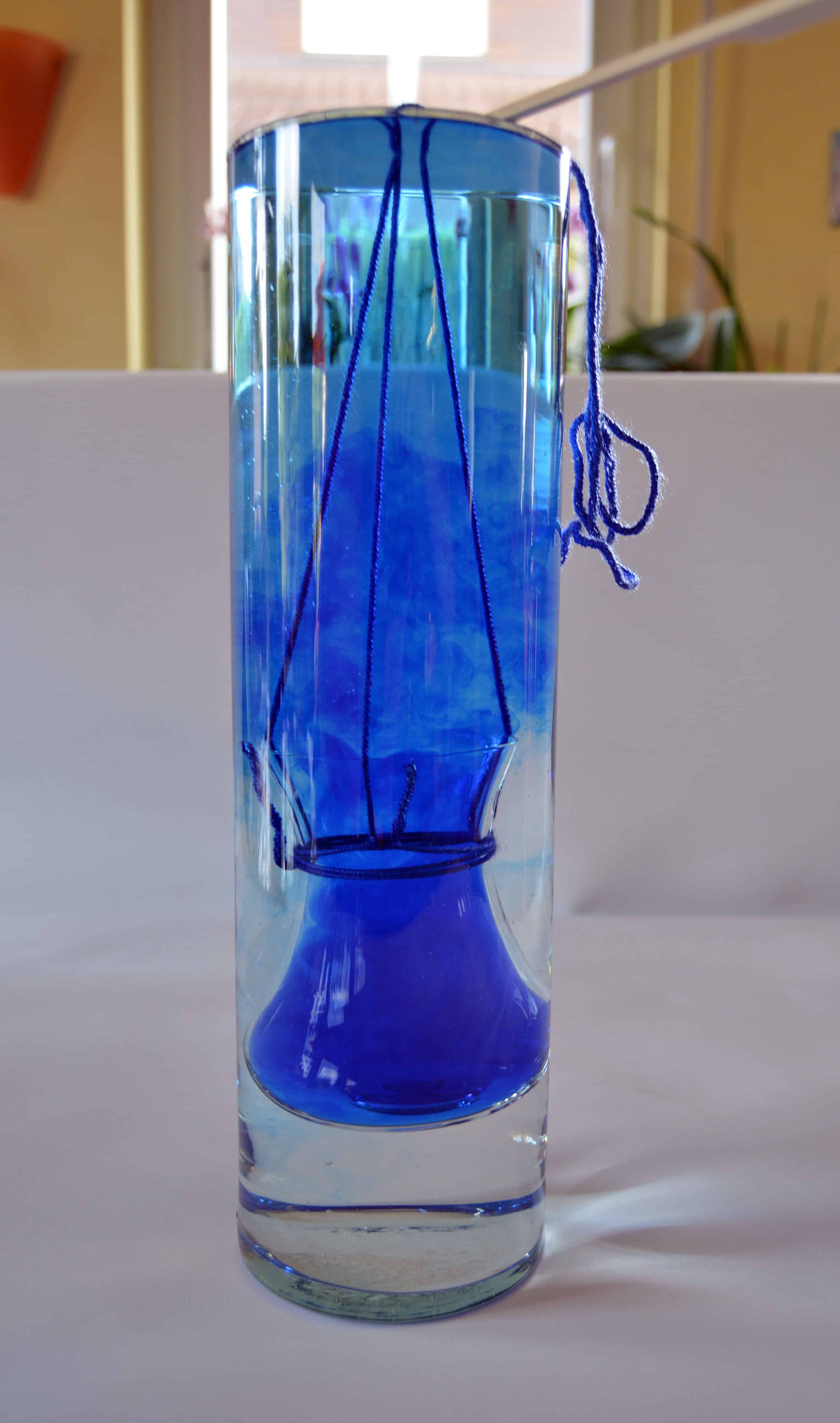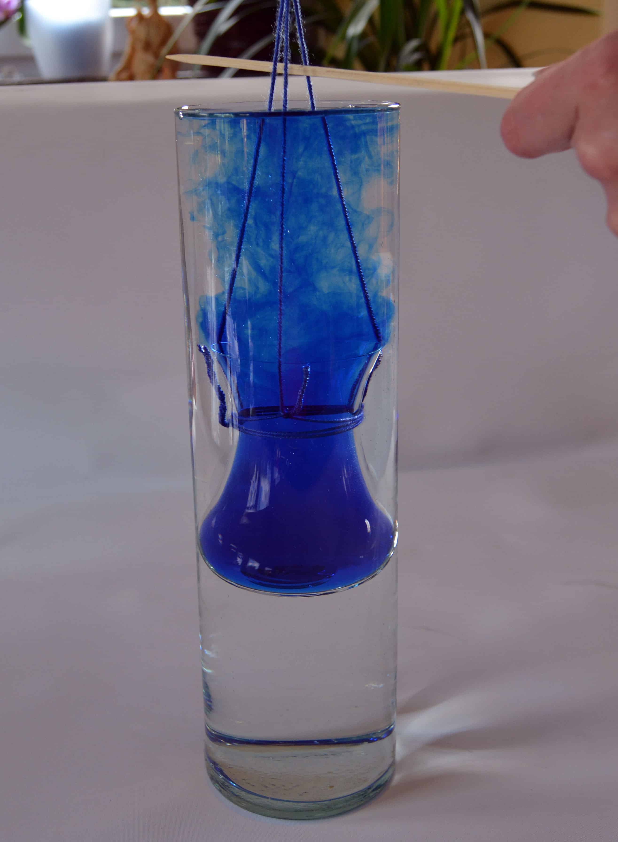 Nun lässt du das kleine Glas ganz langsam und vorsichtig in das große Glas mit dem kalten Wasser gleiten. Der Schaschlikspieß sorgt dafür, dass das Glas mit der Farbe frei im kalten Wasser hängt. Nun kannst du sehen, wie das warme eingefärbte Wasser aufsteigt, bis sich die Temperatur der beiden Flüssigkeiten angeglichen hat.