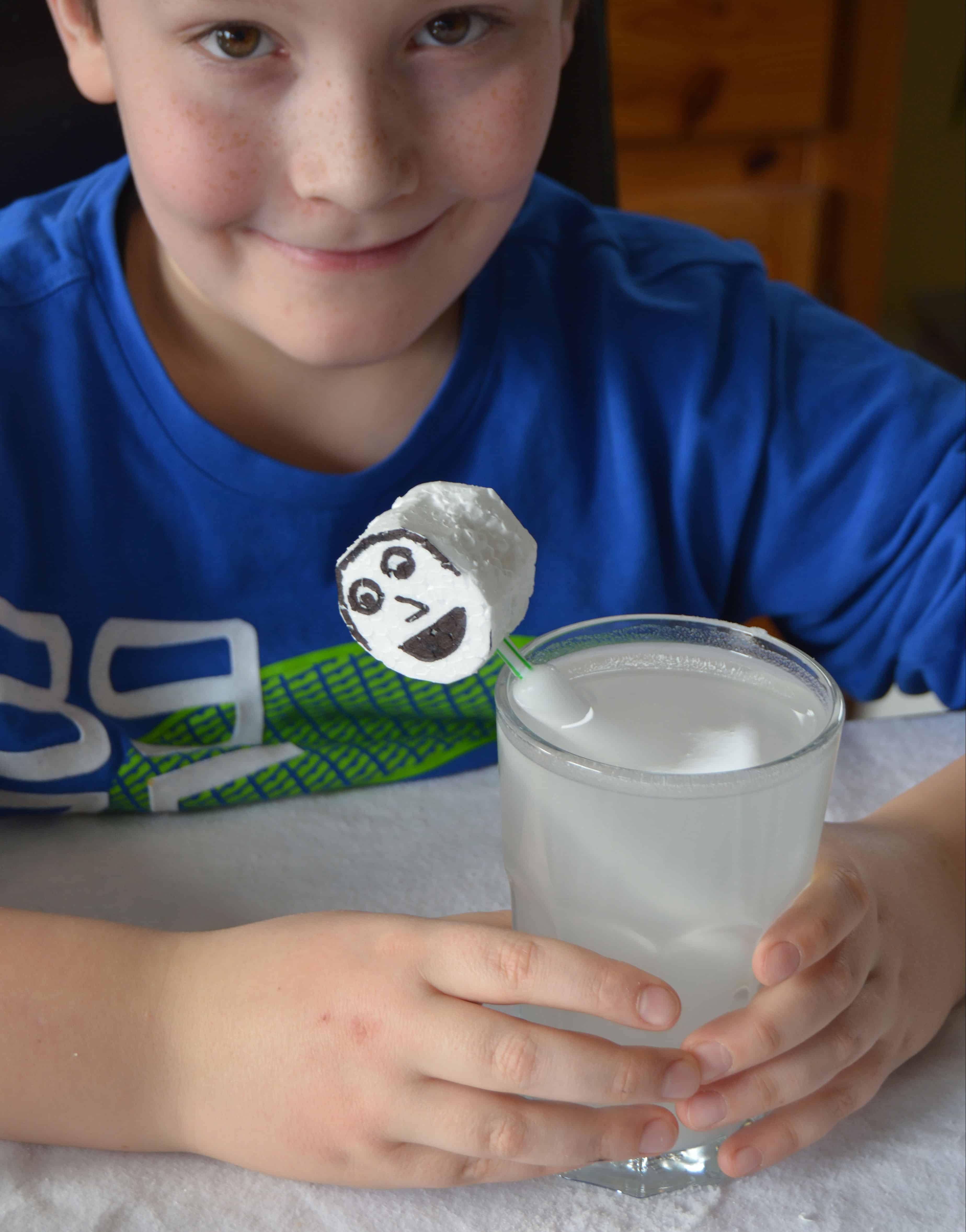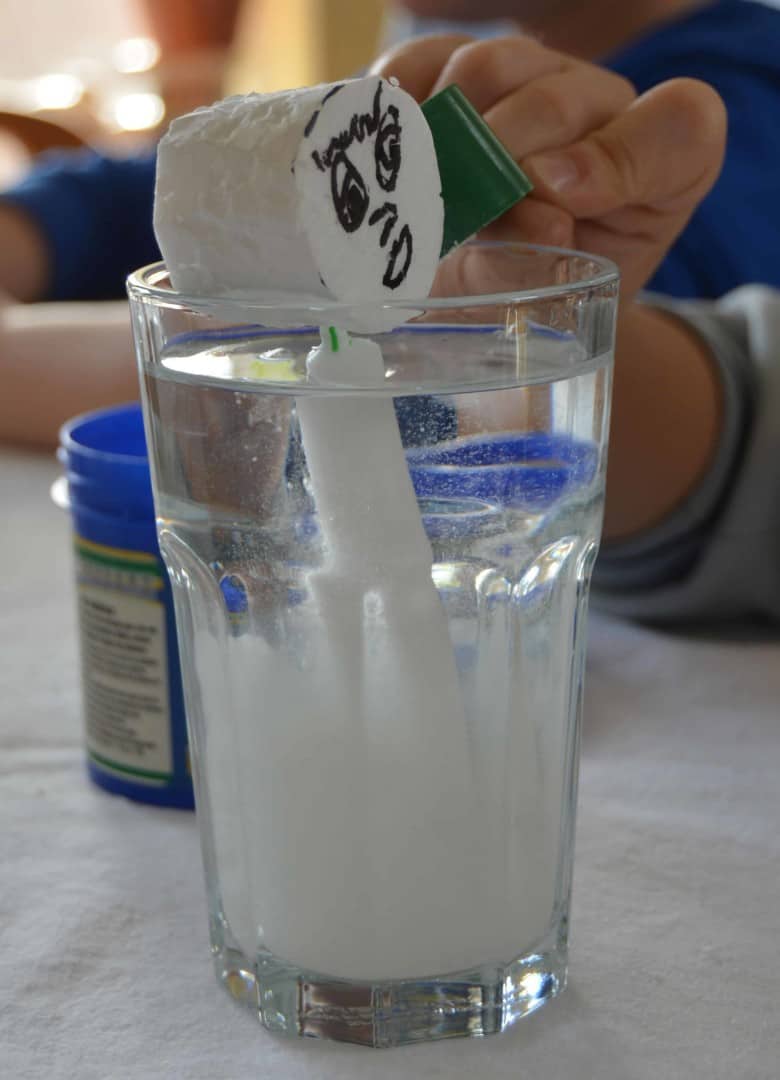 Wenn du nun Salz ins Wasser schüttest, steigt das Monster nach oben. Es schwimmt höher im Glas und streckt den Kopf heraus.