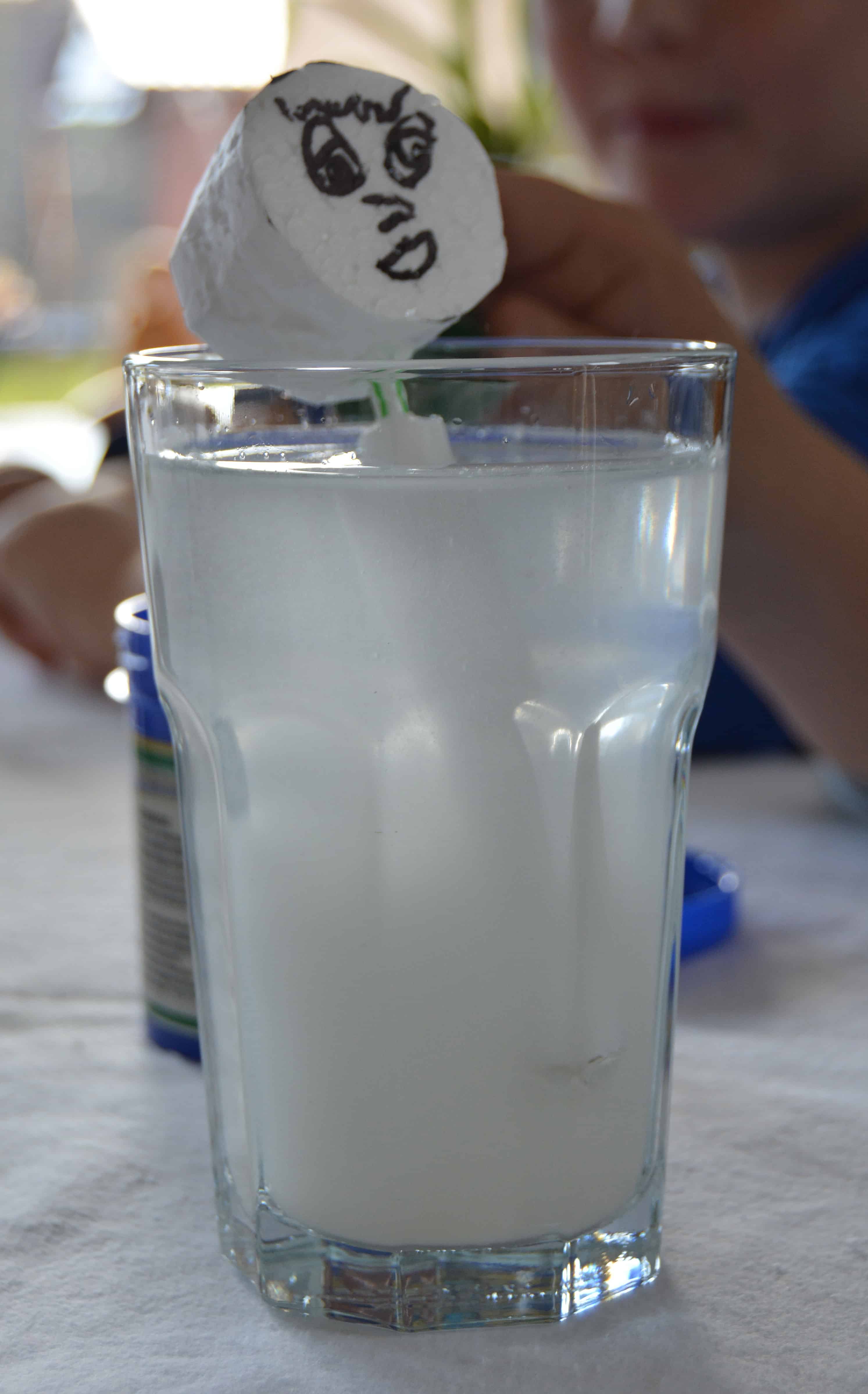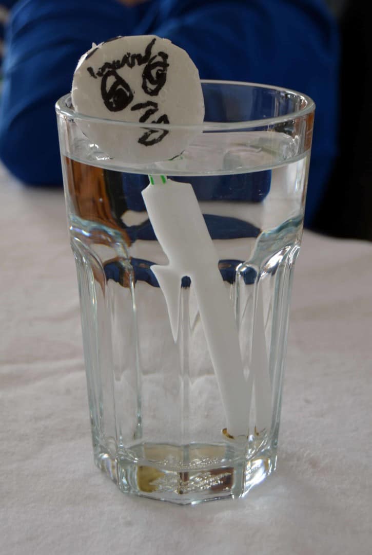 Wir stellen das Monster in ein Glas mit Wasser, nur der Kopf darf heraus gucken, schwimmt es zu hoch, bringe noch eine Reißzwecke an, sinkt es zu tief, nimmst du eine wieder heraus.