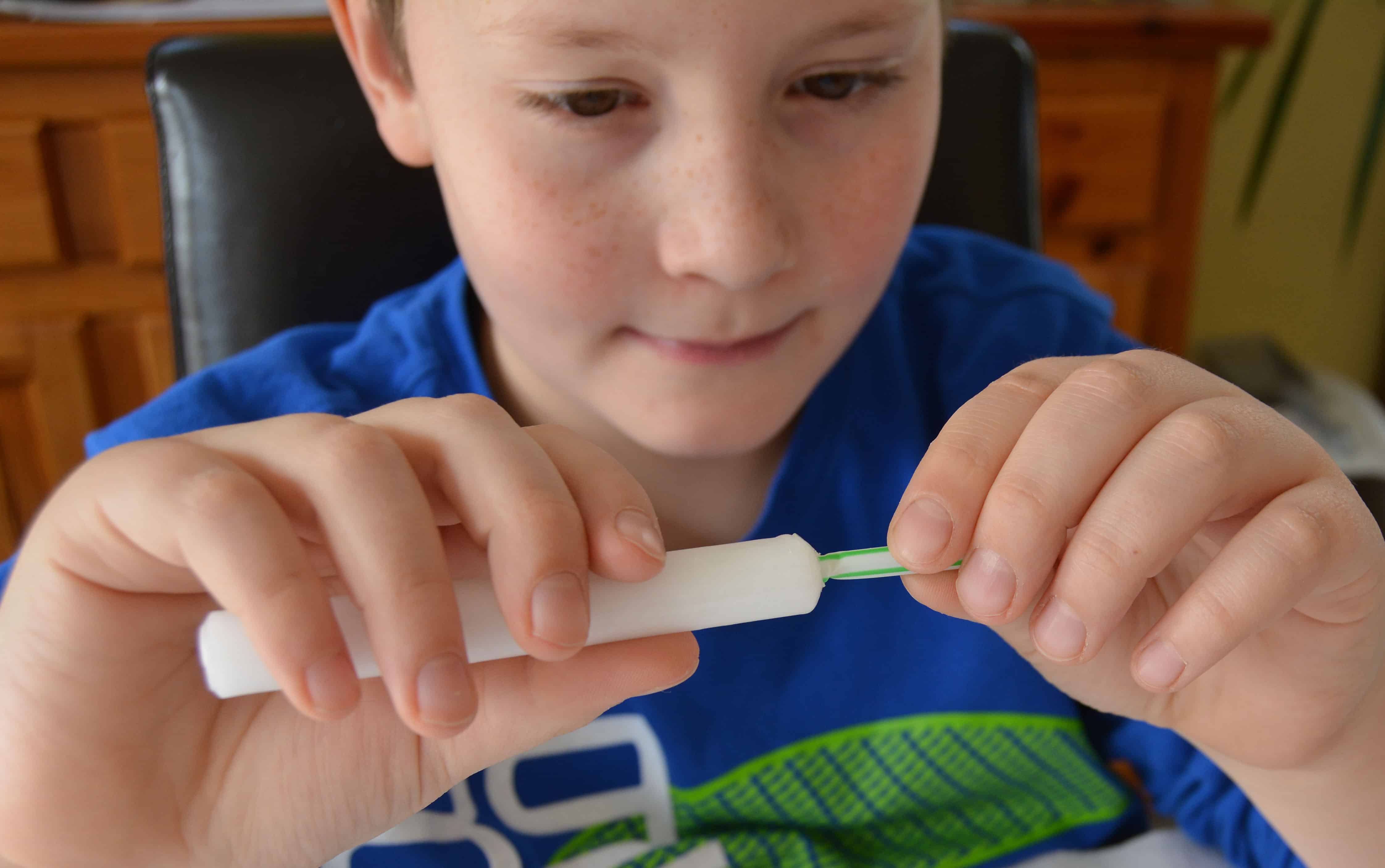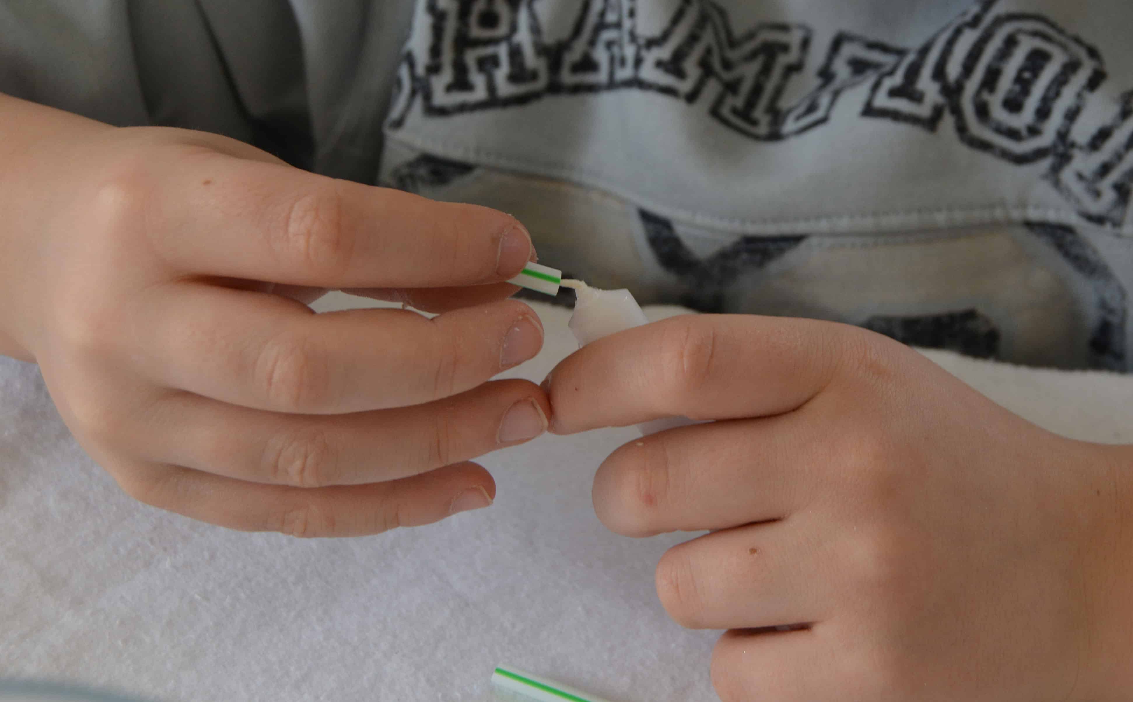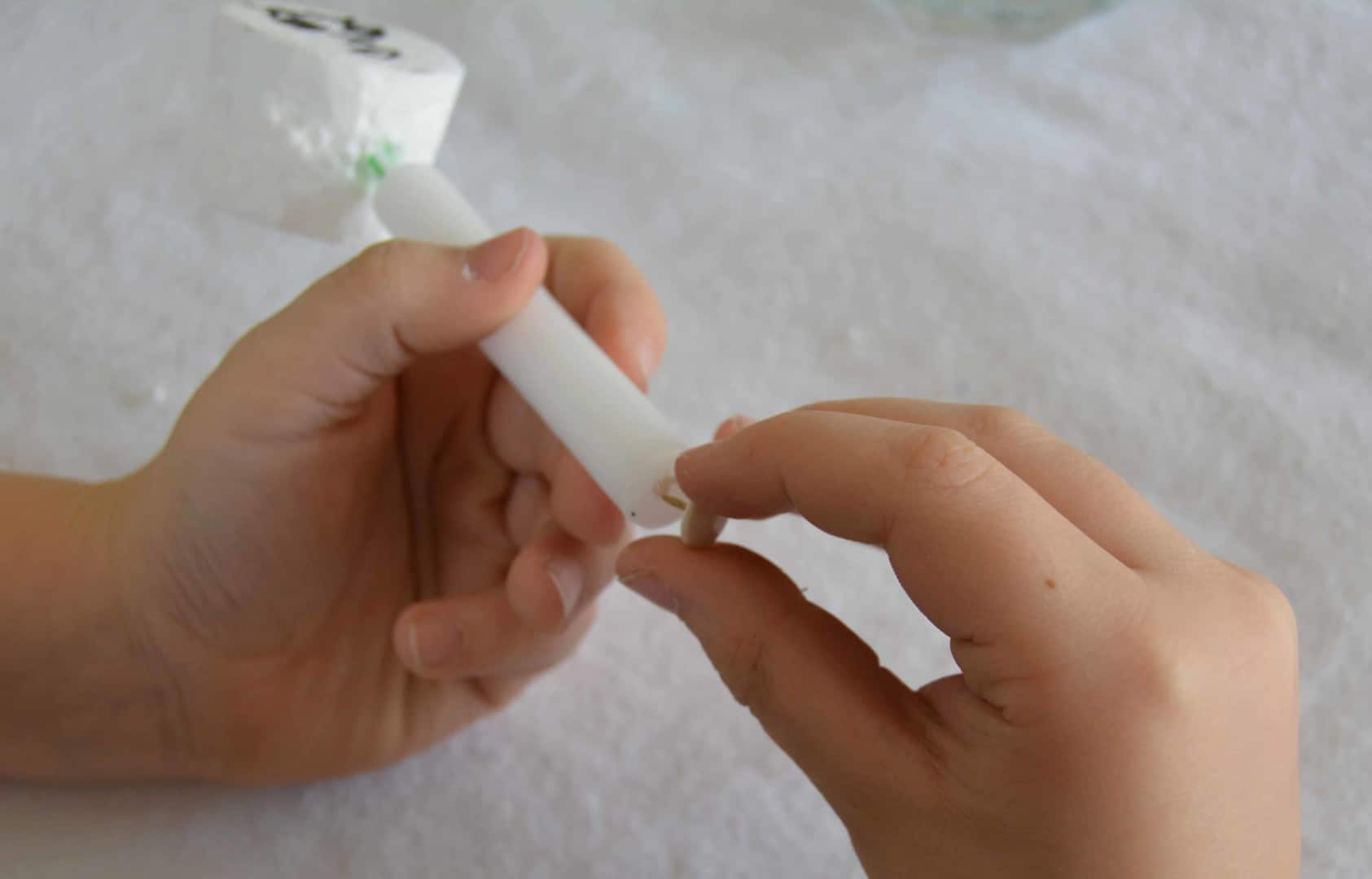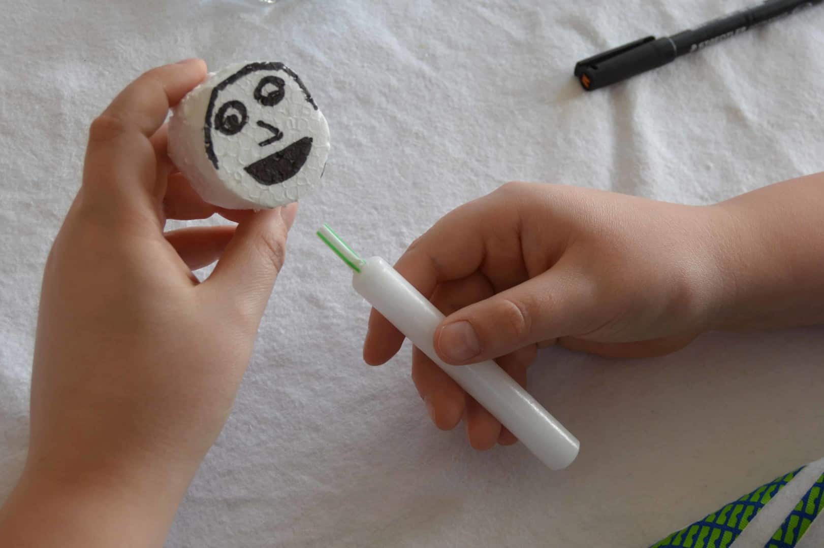 Der Trinkhalm dient als Hals des Monsters und als Verbindungsstück. Wir schneiden ein Stück von dem Trinkhalm ab, stecken es in das Styroporteil und die andere Seite über den Docht der Kerze. Wenn du die Kerze auf die Heizung legst oder mit den Händen erwärmst, geht es etwas leichter.