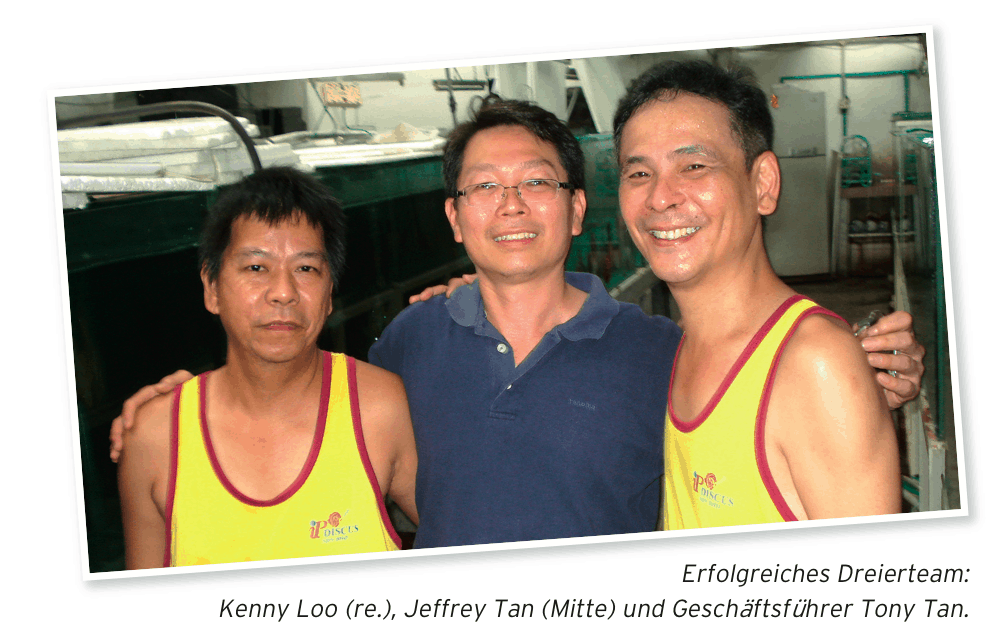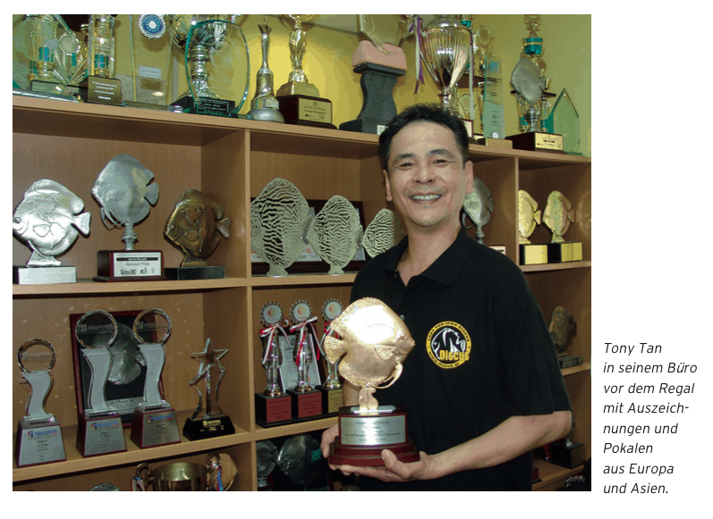 Die Farm teilt sich in mehrere Räume, wobei es reine Zuchträume und Räume für die ausschließliche Aufzucht der Jungfische sowie für die separate Pflege von adulten Fischen gibt. Eingesetzt wird das zur Verfügung stehende weiche Leitungswasser. Gefüttert wird eine Frostfutter-Mischung aus Rinderherz mit Granulat, Shrimps und Spirolina. In den Becken erfolgt ein häufiger Wasserwechsel und eine sehr intensive Beobachtung und Pflege. Wasserqualität und Hygiene sind wichtige Voraussetzungen für die gesunde Zucht und Aufzucht. Tony Tan ist der Fachmann, der durch intensive Beobachtungen und Fachwissen die Zucht gestaltet. So gelingt es immer wieder neue, interessante Farben und Zeichnungsmuster zu kreieren. Und das in sehr guter Qualität. Die Fische kommen in Größen von 4 bis 6 cm zum Verkauf. Alle von IP Discus angebotenen Fische sind eigene Nachzuchten. Ein Auf- und Weiterverkauf von anderen Züchtern erfolgt nicht. In Farbe und Form besonders schöne Diskus dürfen in der Farm zu großen Tieren heranwachsen. Sie sind dann oftmals die erfolgreichen Zuchtfische oder die Gewinner der wichtigen internationalen Wettbewerbe. Die zahlreichen Auszeichnungen im Büro von Tony Tan beweisen es. Tan ist heute ein anerkannt herausragender Züchter von Diskusfischen, unterstützt durch seine freundliche, lebenslustige und sehr aufgeschlossene Art – ein wirklicher „King of discus“.