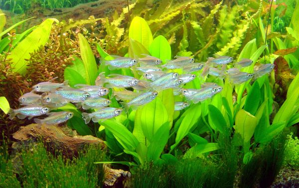 Wenn es um die geeigneten Fische geht, könnte man sich als angehender Aquarianer zunächst einmal ob der riesigen Auswahl überfordert fühlen. Es gibt unzählige Arten von faszinierenden Aquarienfischen, jede davon hat allerdings ihre eigenen Anforderungen und Bedürfnisse. Für Anfänger, die sich möglichst pflegeleichte und farbenfrohe Tiere wünschen, sind Salmler eine gute Entscheidung. Sie sind seit Jahrzehnten die beliebtesten Zierfische überhaupt, und besonders die Neonsalmler sind mit ihrer knallig-leuchtenden Erscheinung der absolute Blickfang im Aquarium. Die circa vier Zentimeter langen Süßwasserfische benötigen nicht viel Platz, deshalb können sie schon in einem Anfängerbecken ab 60 Liter gehalten werden. Sie sind keine Einzelgänger, sondern Gesellschaftstiere, die nur in Gruppen artgerecht gehalten werden können; in kleinen Becken ist durchaus Platz für ein bis zwei Dutzend Exemplare. Es müssen natürlich nicht unbedingt Neonsalmler sein, auch die etwas größeren Kongosalmler zum Beispiel sind lebhafte aber friedliche Gesellen.
