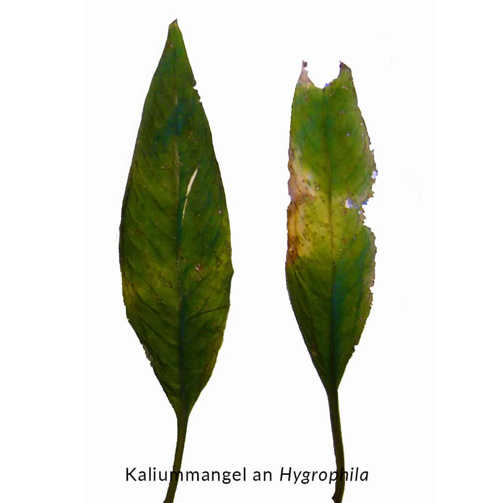 - Große, chlorotische Flecken auf den Blattspreiten, in denen sich punktförmige bis flächige Nekrosen bilden; zum Teil Lochbildung; verkürzte Blattlebensdauer: Kaliummangel