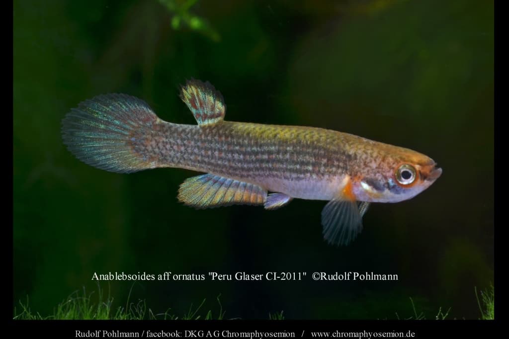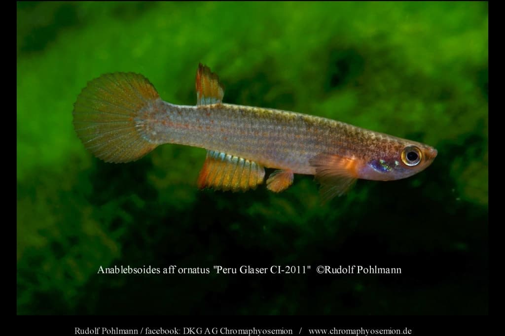 Anablebsoides aff ornatus Peru Glaser CI-2011 besticht durch schillerndes Farbenspiel und elegante Konturen. Artgerechte Einrichtung mit vielen Verstecken unterstreicht seinen Charme. Es sind keine besonderen Merkmale bekannt.