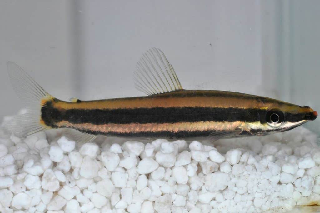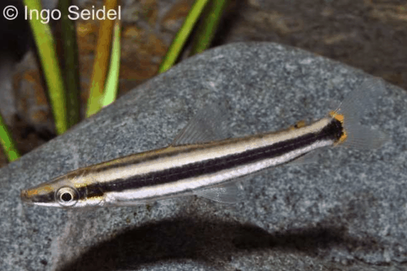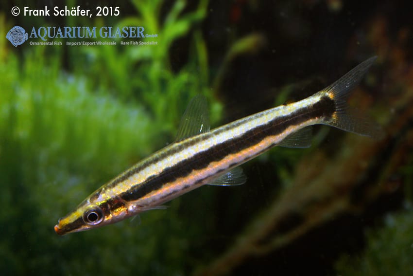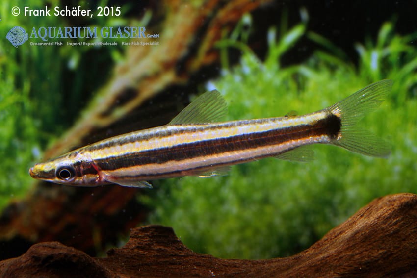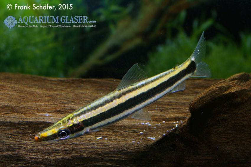 Anostomus ternetzi gehört zu den Characiden und wird oft als Goldstreifen-Prachtkopfsteher bezeichnet. Der Fisch erreicht im Schnitt etwa 7 cm und zeigt einen schlanken, leicht abgeflachten Körper. Sein silberner Schimmer wird von feinen, goldenen Streifen überzogen, die sich harmonisch mit dem dunkleren Rücken verbinden. Anostomus ternetzi stammt aus tropischen Flüssen Südamerikas, wo das klare, leicht sauer bis neutral geführte Wasser vorherrscht. In seinem Lebensraum finden sich dichte Vegetation und strömungsarme Bereiche, die Schutz und Nahrung bieten. Der Fisch zeigt ein aktives Schwarmverhalten und ist in der Lage, sich an wechselnde Wasserbedingungen anzupassen. Im Aquarium benötigt er reichlich Platz, eine Wassertemperatur von etwa 26 °C und weiche, leicht saure bis neutrale Werte. Diese Bedingungen unterstützen sein natürliches Sozialverhalten und seine Nahrungsaufnahme, die überwiegend aus kleinen Wirbellosen besteht. Einige Quellen weichen bei Angaben zu Körpergröße und Temperatur leicht ab, was auf regionale Unterschiede zurückgeführt werden kann.
