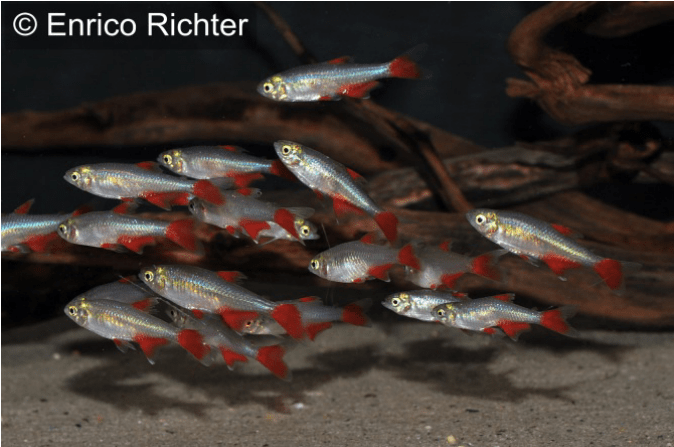 Aphyocharax anistisi besticht durch leuchtend rote Flossen und eine schlanke, elegante Körperform. Er zeigt aktives Schwarmverhalten und reagiert lebhaft auf Interaktion in der Gruppe. Sein natürlicher Charme entfaltet sich in behutsam gepflegten Gemeinschaftsaquarien.