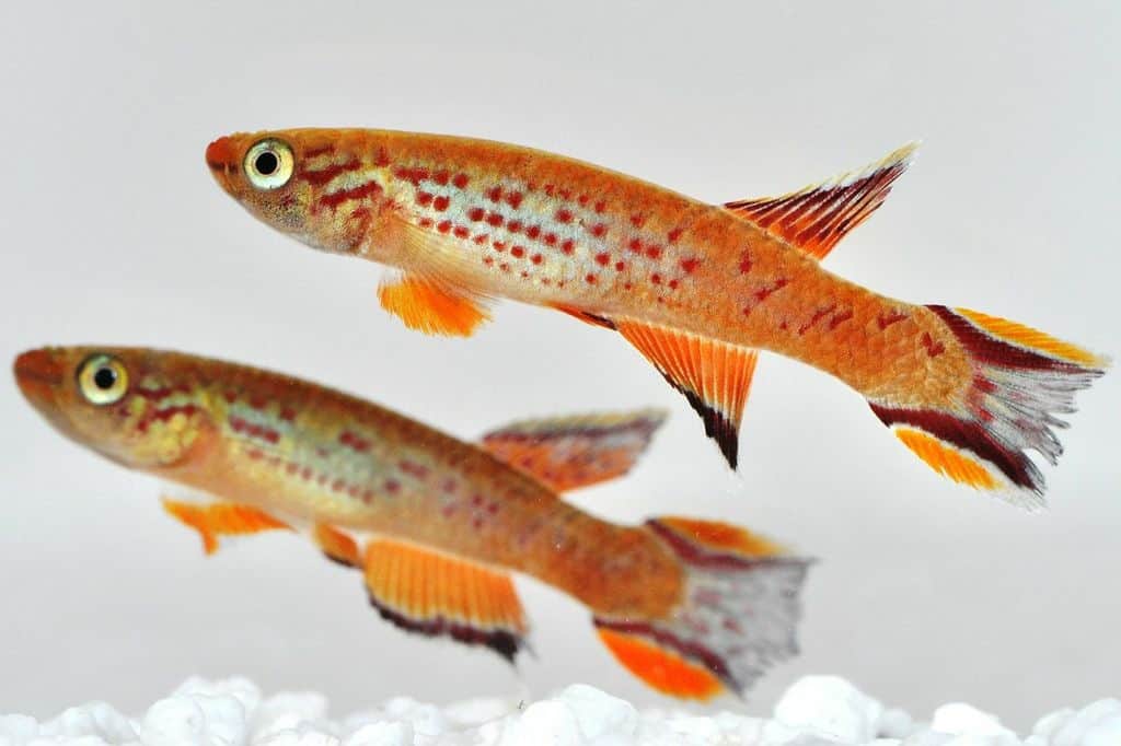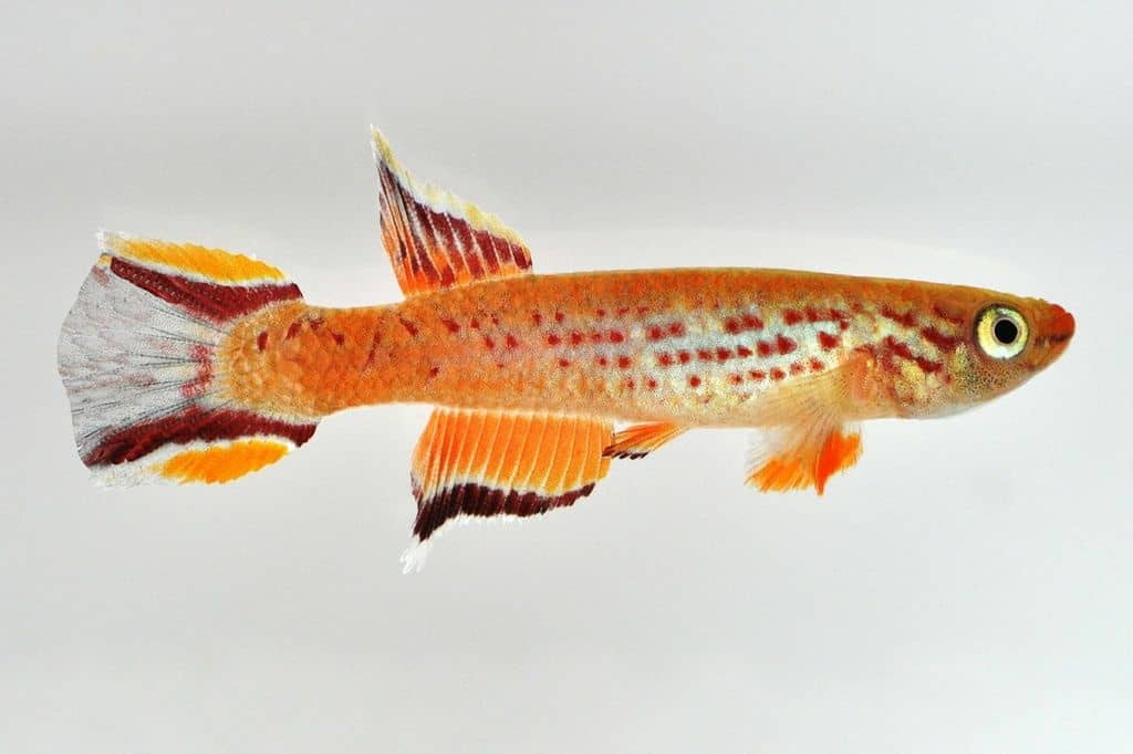 Männchen: Sie zeichnen sich durch eine intensive, leuchtende Färbung aus – häufig in Gold- und Rotnuancen –, deutlich verlängerte und abgefasste Rücken- und Afterflossen sowie ein markantes, variabel gemustertes Flossenbild, das vor allem im Balzverhalten zum Einsatz kommt.