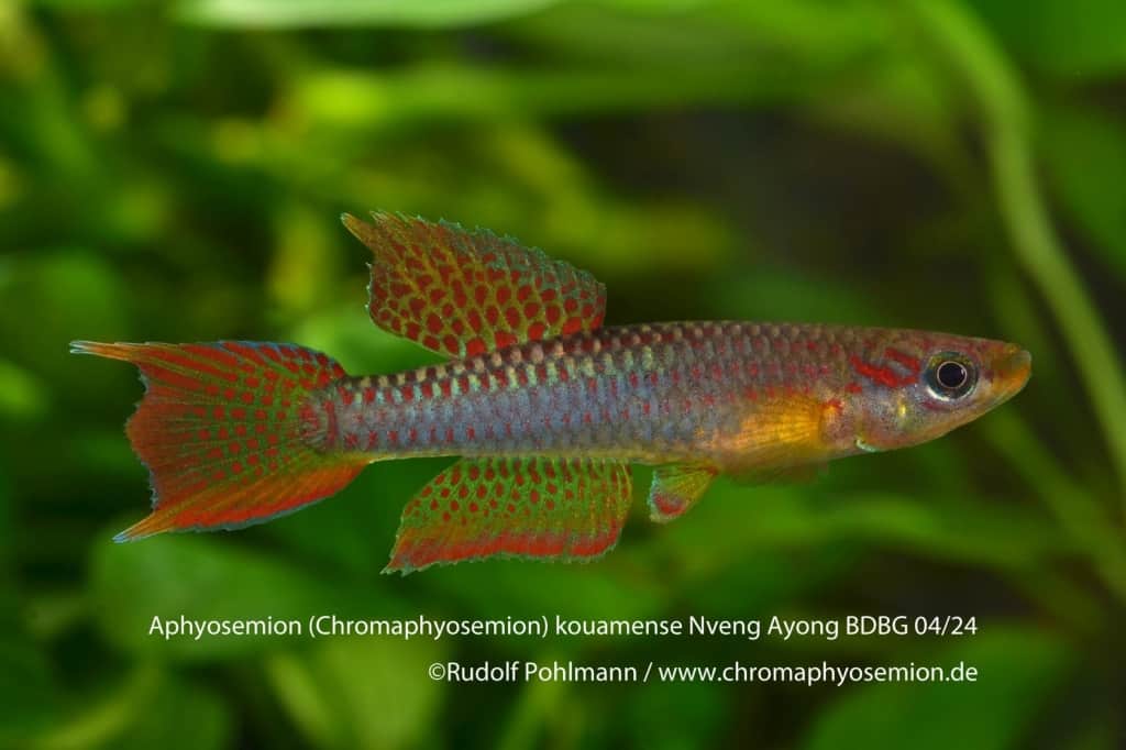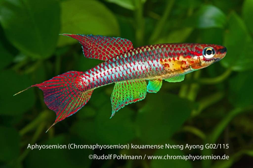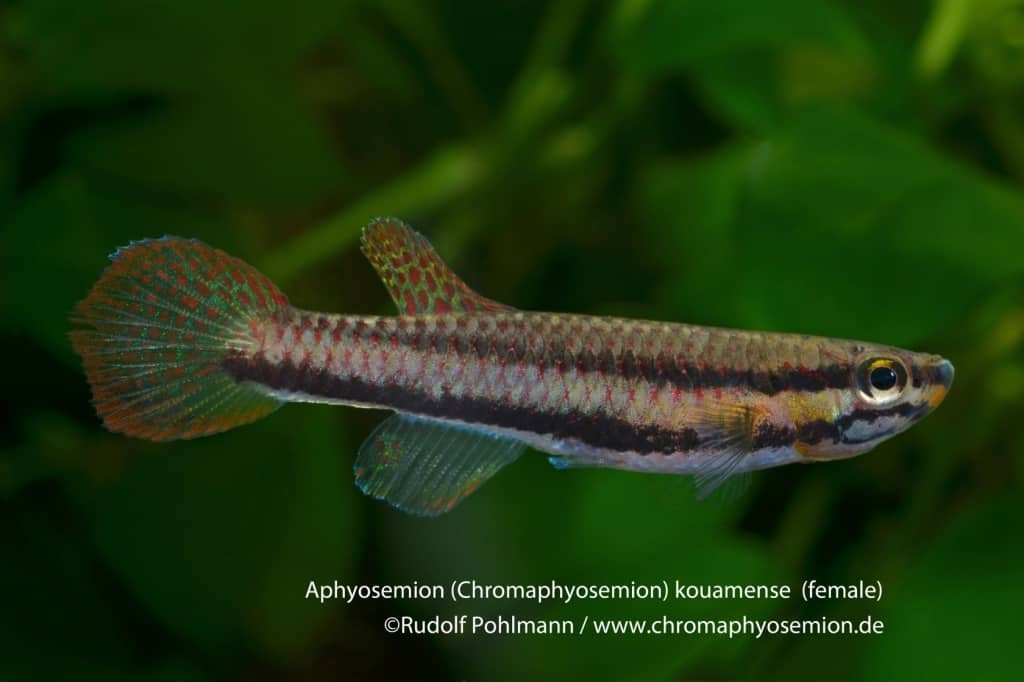 Aphyosemion (Chromaphyosemion) kouamense Kouamense – Zweistreifen Prachtkärpfling fasziniert mit leuchtenden Farben, zwei Streifen sowie aktivem Balz- und Revierverhalten. Ein naturnaher Lebensraum mit Rückzugsmöglichkeiten fördert sein Wohlbefinden. Es sind keine besonderen Merkmale bekannt.