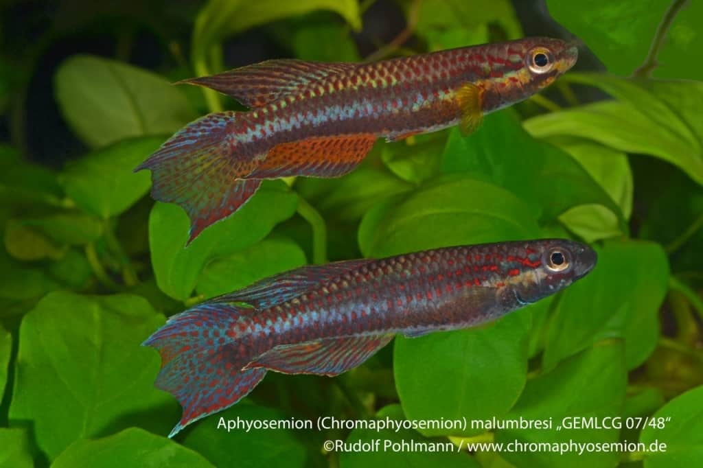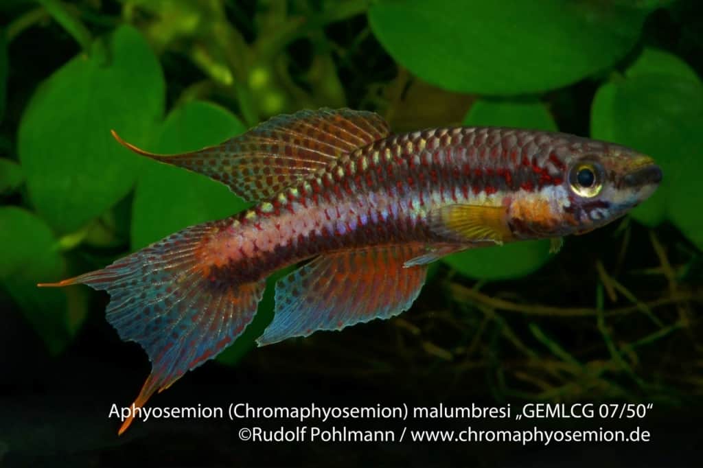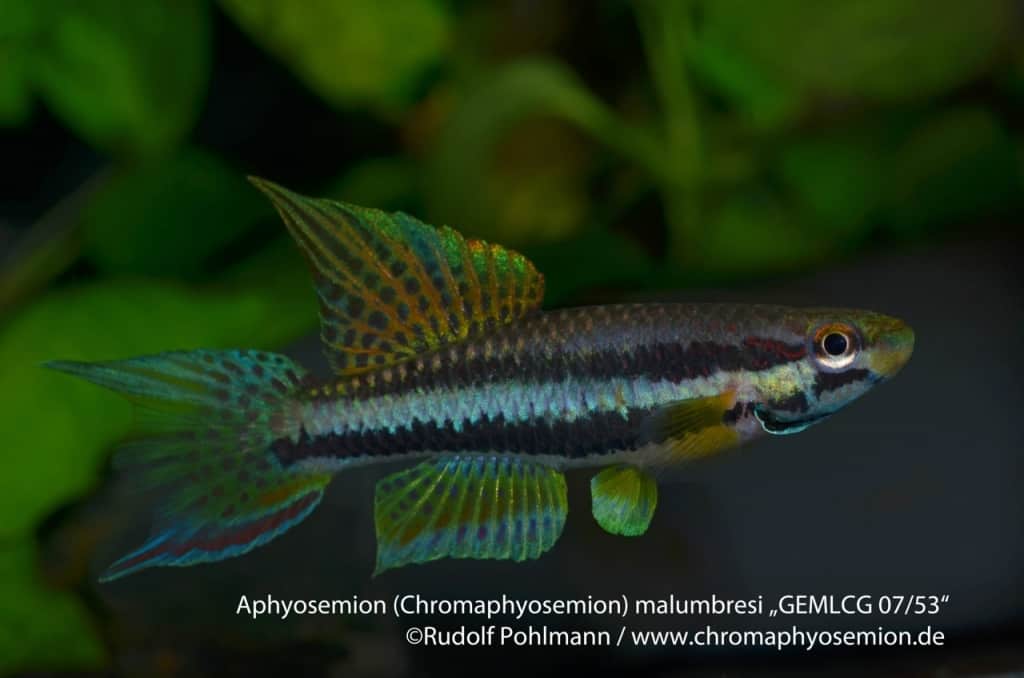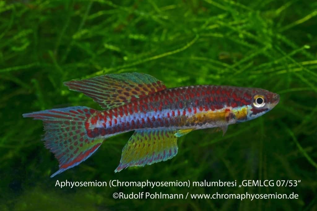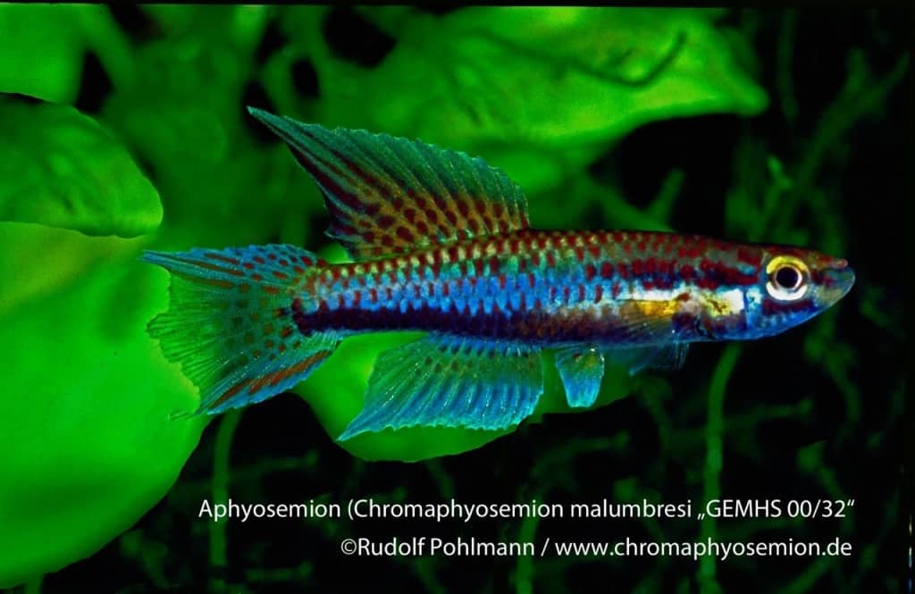 Aphyosemion (Chromaphyosemion) malumbresi gehört zur Familie der Nothobranchiidae und zur Ordnung Cyprinodontiformes. Der Fisch misst im Schnitt etwa 5 cm und zeigt zwei klare Streifen an seinem Körper. Die Färbung ist lebhaft mit blauen und roten Akzenten, die im Licht schimmern. Er lebt in kleinen, flachen Gewässern in tropischen Regionen, wie auf my-fish.org berichtet wird. Die Art zeigt ein ausgeprägtes Revierverhalten und schnelle Fluchtreaktionen vor Fressfeinden. Sie passt sich dem wechselnden Wasserstand durch schnelle Wachstumsschübe gut an. Im Aquarium wird ein warmes Wasser bis 26 Grad und viele Verstecke empfohlen, um naturnahe Bedingungen zu schaffen.