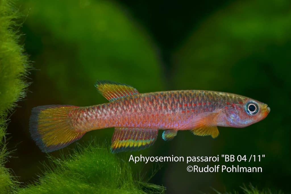 Aphyosemion passaroi, der Passaroi Prachtkärpfling, gehört zu den Killifischen und ist Teil der Klasse der Knochenfische. Er erreicht im Mittel eine Länge von etwa 4,5 cm und zeigt leuchtende Farben. Sein Körper hat zarte, rote und blaue Farbakzente, die oft von goldenen Streifen begleitet werden. Die Flossen sind schmal und wirken fast durchsichtig. In seinem natürlichen Lebensraum lebt er in flachen, pflanzenreichen Gewässern Westafrikas. Dort wechseln Wasserstände und Temperaturen, was seinen Überlebensrhythmus bestimmt. Der Fisch zeigt auffällige Balzrituale, bei denen Männchen ihre Farben intensiv präsentieren. Er nutzt flüchtige Wasserläufe, um Futter zu suchen, und passt sich Temperaturen zwischen 23 und 27 Grad an. Im Aquarium bevorzugt er sauberes, leicht saures Wasser mit vielen Versteckmöglichkeiten. Einige Quellen weichen bei den Messwerten leicht voneinander ab, was auf natürliche Schwankungen hinweist.