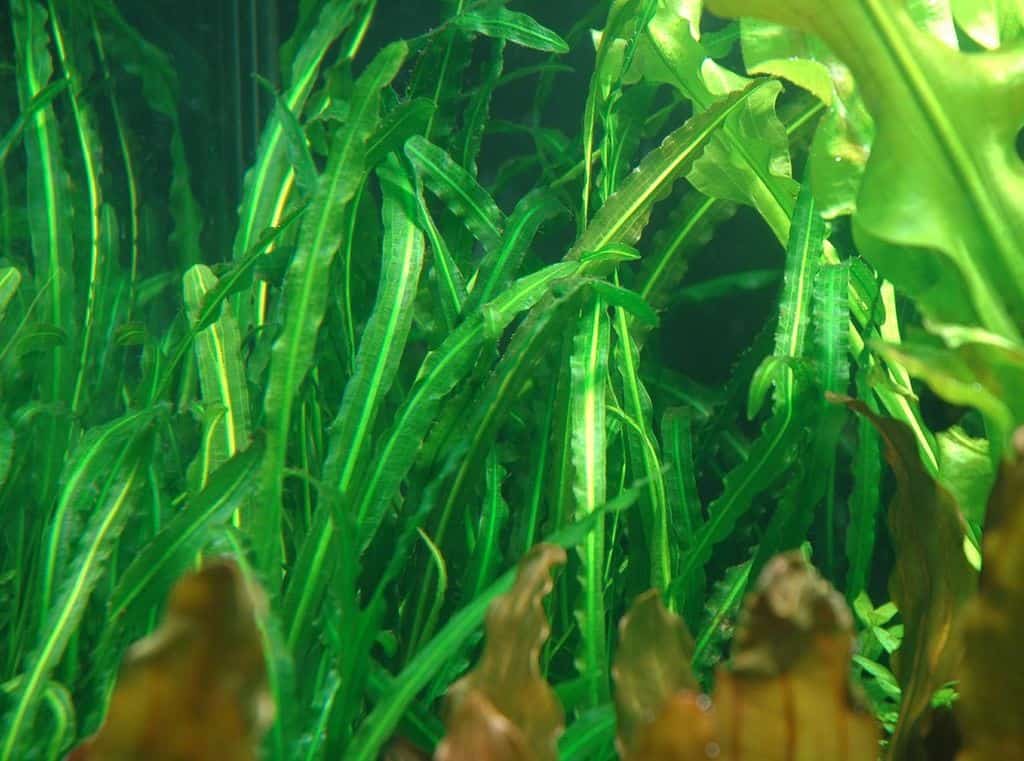 Die Pflanze zeigt schmale, bandförmige Blätter, die in einer Rosettenform wachsen. Ihre Blätter sind grünlich und weisen eine leicht glänzende Oberfläche auf. Ein auffälliges Merkmal ist die hohe Blütenstange mit filigranen, federartigen Blütenständen. Dieser feine Blütenansatz ermöglicht eine effektive Bestäubung. Die Unterwasserstruktur gehört zu den typischen Eigenschaften der Gattung, wobei die Blattstellung dem Licht optimalen Zugang gewährt.