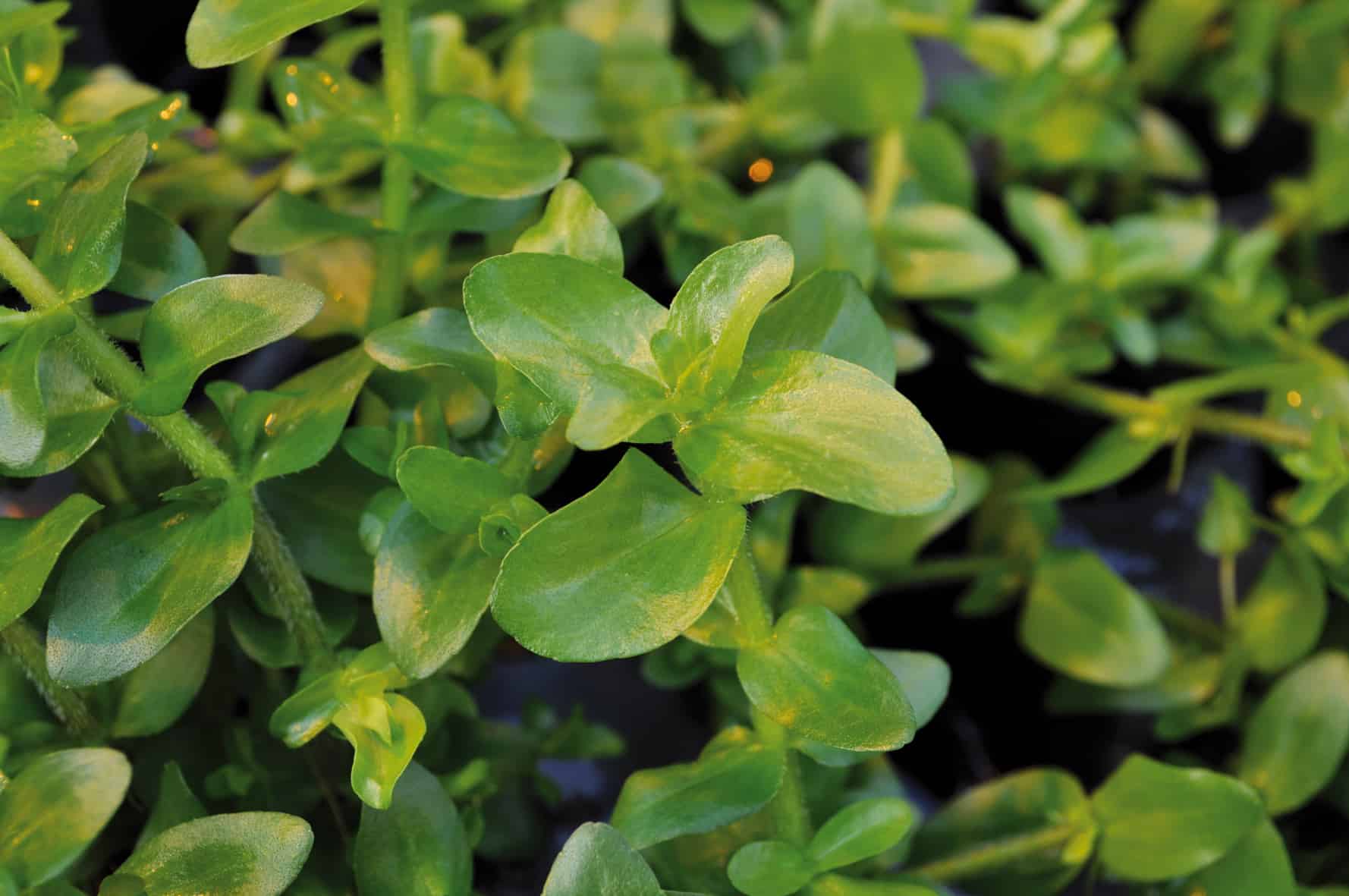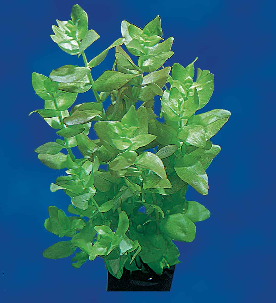 Das Große Fettblatt zeigt breite, fleischige Blätter, deren glatte Oberfläche einen dezenten Glanz besitzt. Die Blätter weisen deutlich sichtbare Blattadern auf, die als Leitbahnen für Wasser und gelöste Stoffe dienen. Kleine, unscheinbare Blüten können unter optimalen Wachstumsbedingungen auftreten. Ein prägnantes Merkmal der Pflanze ist der robuste Stängel, der in Kombination mit den kräftigen Blättern ein markantes Erscheinungsbild ergibt. Diese Merkmale machen Bacopa caroliniana leicht erkennbar und bei Aquarianern und Botanikern gleichermaßen beliebt.
