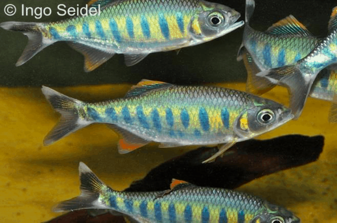Barilius canarensis, der Rotflossen-Blaubandbärbling, besticht durch leuchtend rote Flossen und markante blaue Querstreifen, die seinen schlanken Körper zieren. Er zeigt ein aktives, soziales Schwarmverhalten und benötigt eine behutsame, artgerechte Haltung.