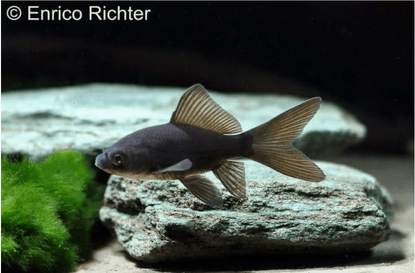 Männchen: Während der Laichzeit wirkt das Männchen schlanker und weist eine spitz zulaufende Genitalpapille auf, die häufig von kleinen Brütestuberkeln an den Flossen begleitet wird.