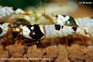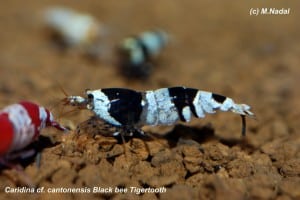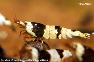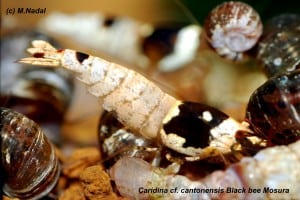 Caridina cf. cantonensis – Black bee gehört zur Familie Atyidae. Die Art wird oft als Zwerggarnelenart bezeichnet. Sie ist mit dem Stichwort „Bee Shrimp“ bekannt. Die Garnelen erreichen im Schnitt eine Körperlänge von 2,5 cm. Ihr Panzer ist dunkel mit feinen, oft hellen Akzenten. Die Schale zeigt einen matten Glanz und klare Muster. Dabei variieren die Muster leicht, was auch zu Unsicherheiten in der Artbestimmung führt.